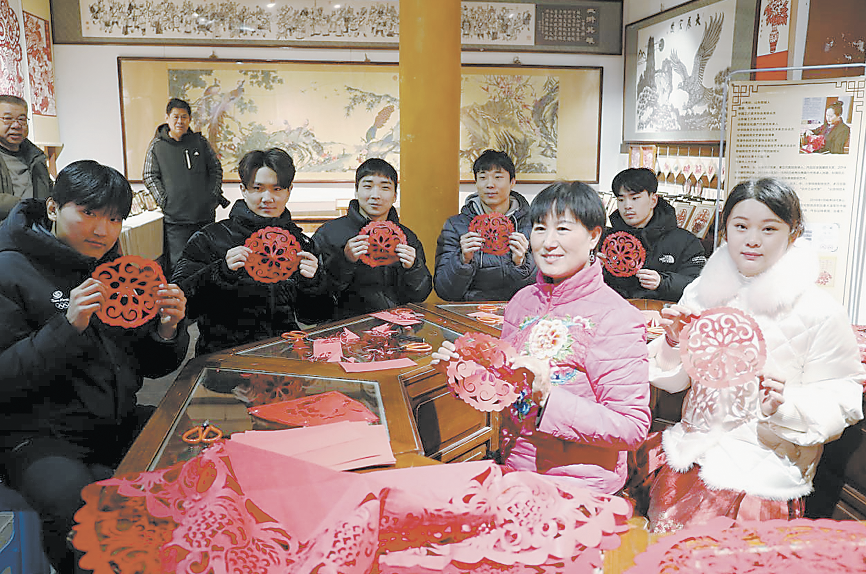 鄭成勛一行步入楊秀玲剪紙藝術館時,鄆城剪紙非遺代表性傳承人楊秀玲與張璐正沉浸于“當哪吒遇見牡丹”系列作品的創作中。尹汝重(韓國)望著栩栩如生的哪吒形象與環繞其四周的絢爛牡丹,不禁對其精湛技藝發出由衷贊嘆:“哇,哪吒,是很厲害很火爆的哪吒!”隨后,楊秀玲向大家講述了剪紙的基礎知識與簡易操作技巧,以紙為媒,帶領眾人體驗“陰陽鏤刻”之妙。彩紙翻飛間,韓國友人們化身“非遺學徒”,全神貫注地投入到“剪窗花”這一傳統習俗創作之中。