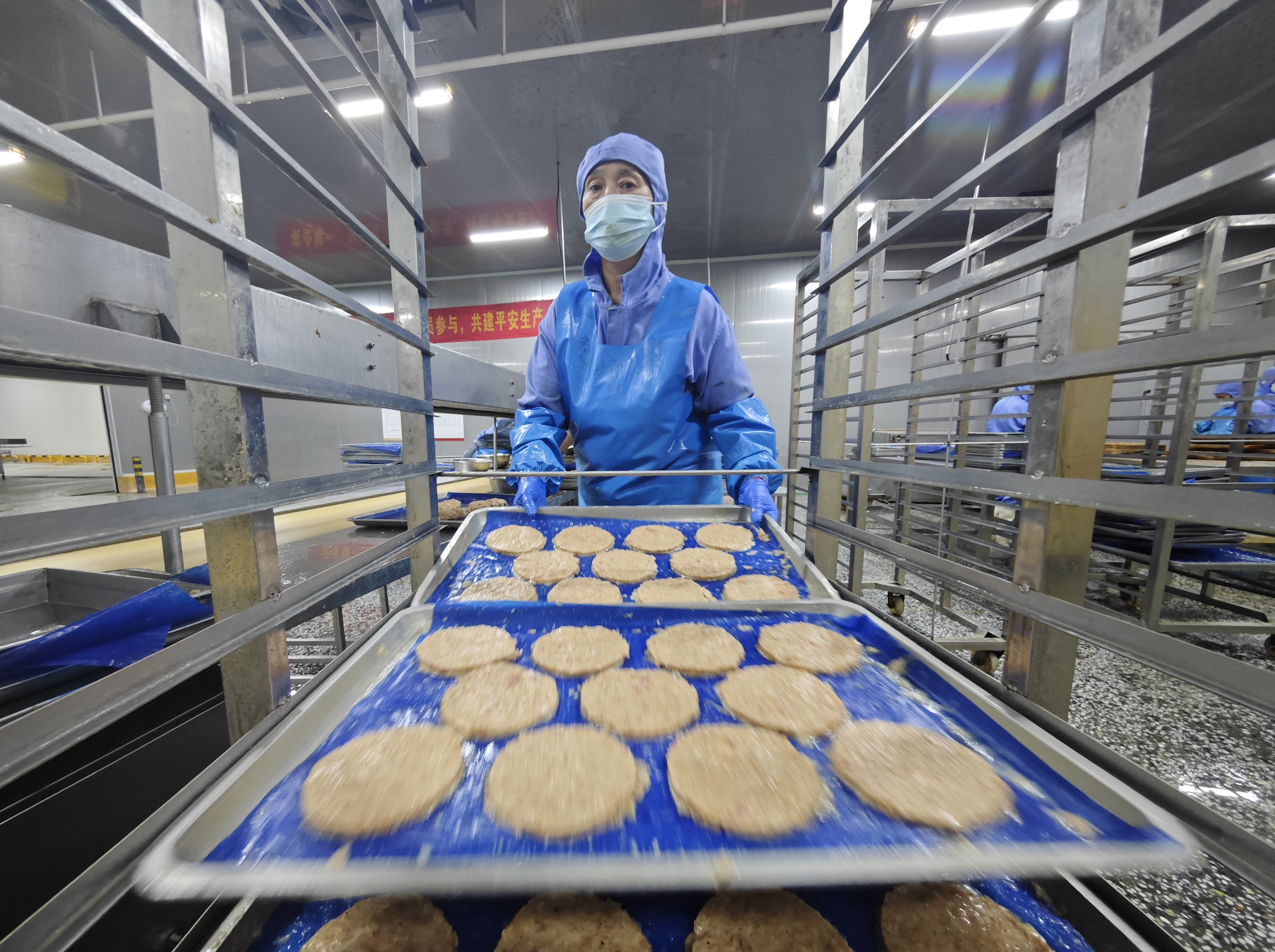 3月6日,成武縣隆達眾成農產品有限公司預制菜生產車間,工人正在生產預制菜。據了解,該公司主營預制菜及禽肉速凍調理半成品,其中預制菜可實現年產5萬余噸,年產值1.3億元,帶動就業700余人。