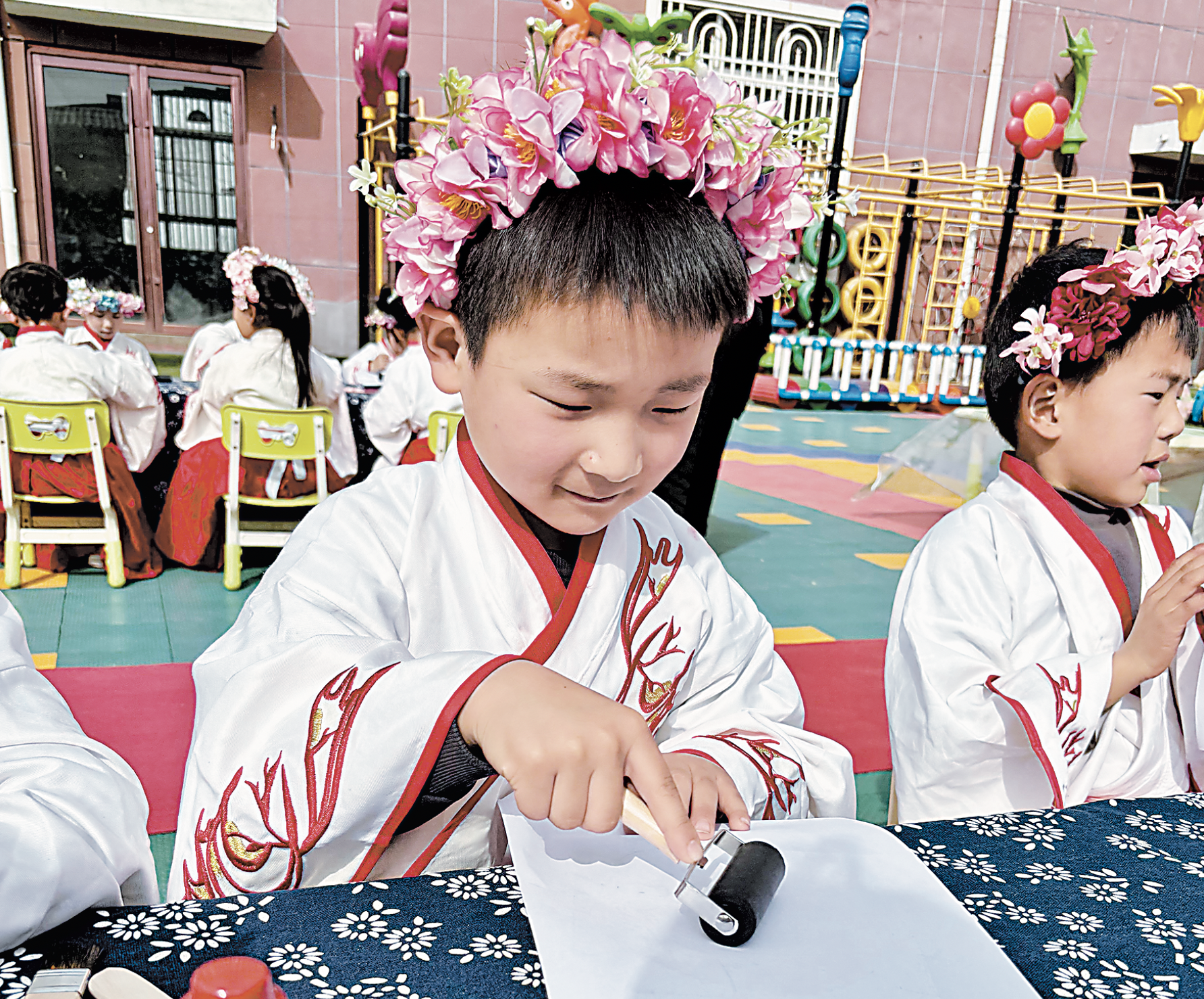 3月13日,曹縣普連集鎮(zhèn)鐘口幼兒園舉辦了一場別開生面的“非物質(zhì)文化遺產(chǎn)進校園”活動。活動現(xiàn)場,孩子們在非物質(zhì)文化遺產(chǎn)代表性傳承人的悉心指導(dǎo)下,使用拓印工具輕輕按壓雕版,紙張上逐漸顯現(xiàn)出古樸的圖案。此外,孩子們還將親手制作的簪花佩戴在頭上,身著漢服合影留念。此次活動以寓教于樂的方式,將非物質(zhì)文化遺產(chǎn)從靜態(tài)展示轉(zhuǎn)化為動態(tài)參與,不僅保護了傳統(tǒng)技藝的活態(tài)傳承,還培養(yǎng)了兒童的文化自信。