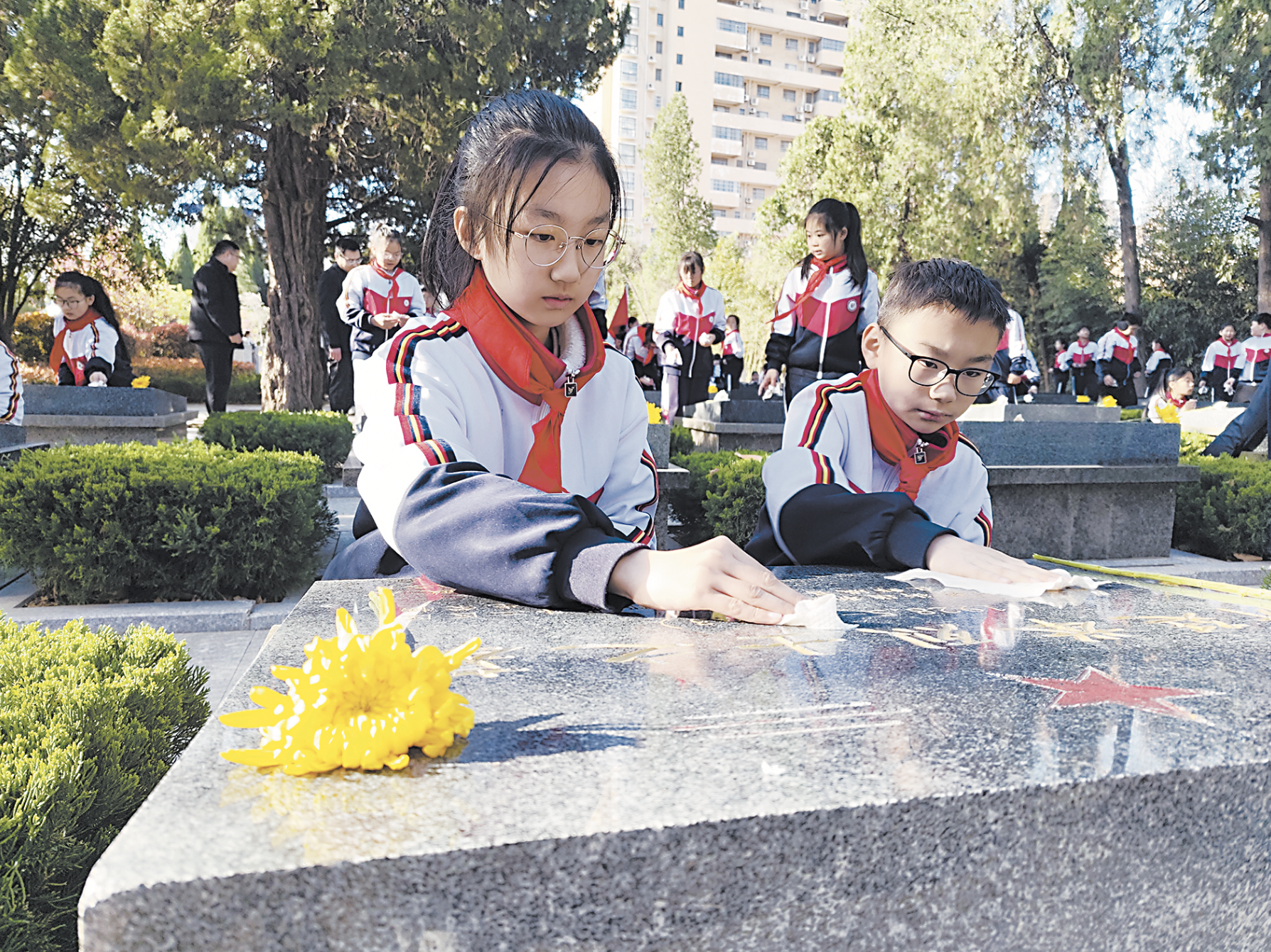 4月2日,鄄城縣開展“賡續(xù)·2025·清明祭英烈”活動,各機關(guān)單位、學校等團體,分批次前往縣烈士陵園開展祭掃活動,通過緬懷先烈,傳承紅色基因,凝聚奮進力量。圖為鄄城縣實驗小學學生為烈士掃墓。