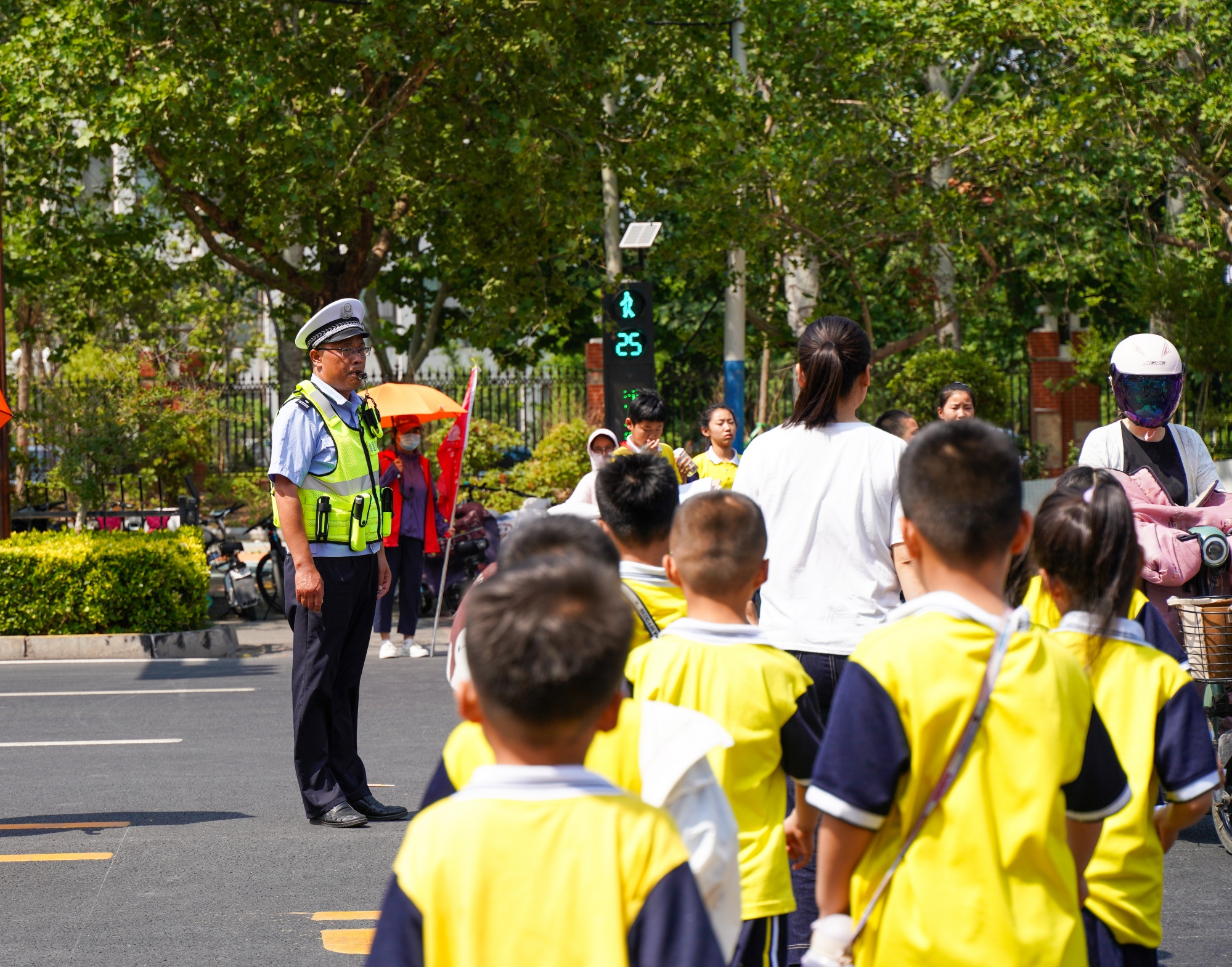 連日來,我市持續高溫,局部最高氣溫突破40℃。在校園周邊,交警們不懼高溫,頂著烈日堅守“護學崗”,用汗水守護學生平安出行。這是5月20日單縣公安局交警大隊民警在校門口疏導交通,護送學生過馬路。