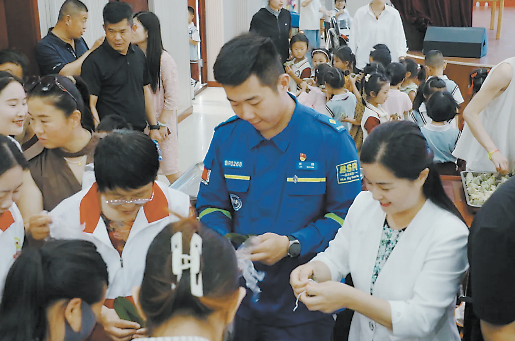 “我們的節日· 端午——粽香傳溫情 人道暖人心”主題活動中,紅十字文化志愿者向居民示范包粽子的步驟。起初有的居民手法生疏,包的粽子形狀各異,但在志愿者的鼓勵和指導下,手法熟練起來。大家圍在一起,歡聲笑語,現場洋溢著溫馨和諧的氣氛。