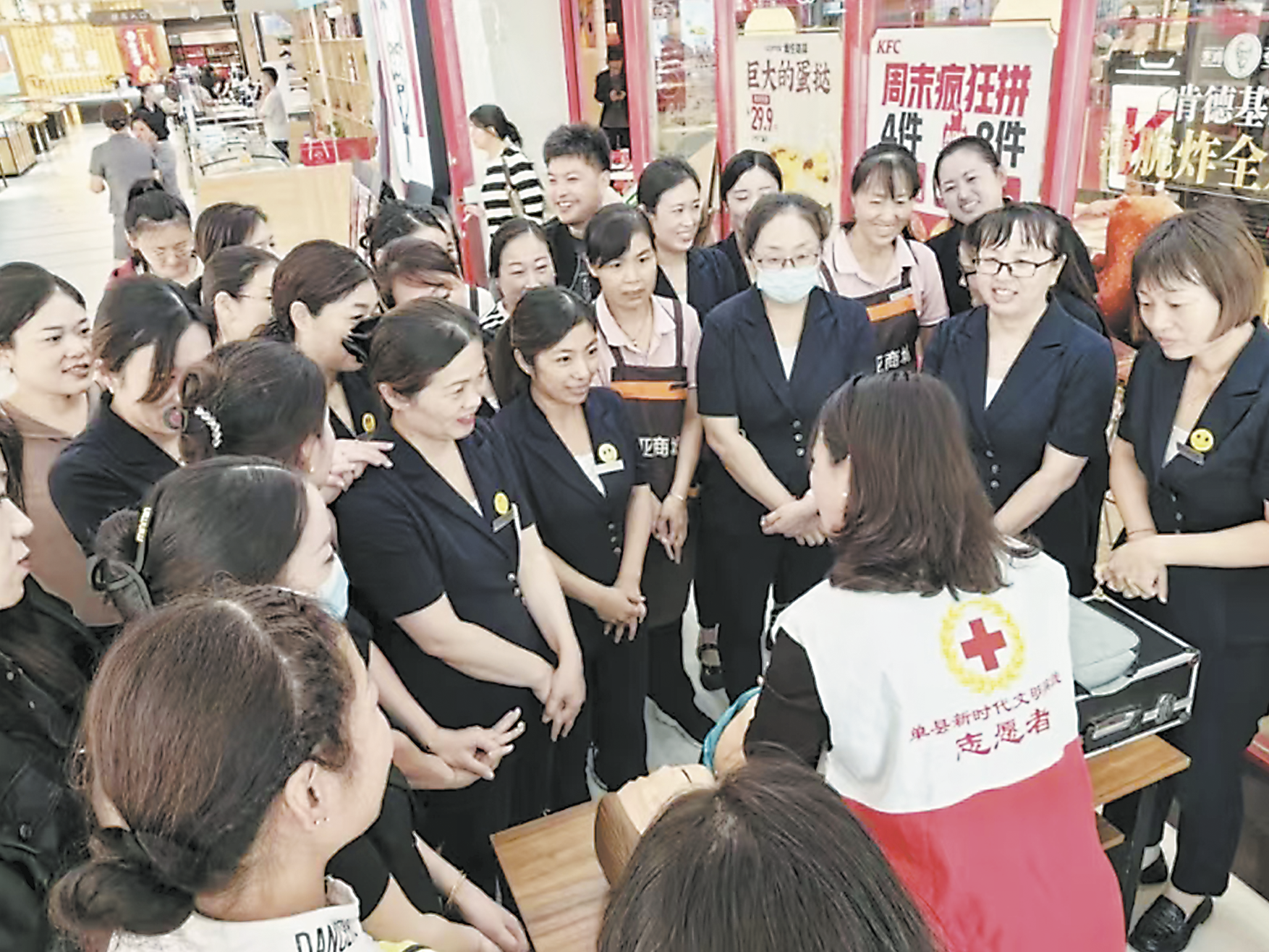 在單縣新時代文明實踐“善益站”,單縣紅十字文化傳播活動吸引眾多居民參與,應急救護講師現場講解心肺復蘇、AED使用等急救技能,指導群眾實操練習,提高大眾對應急救護知識的認識,讓群眾身邊的急救人員多起來。