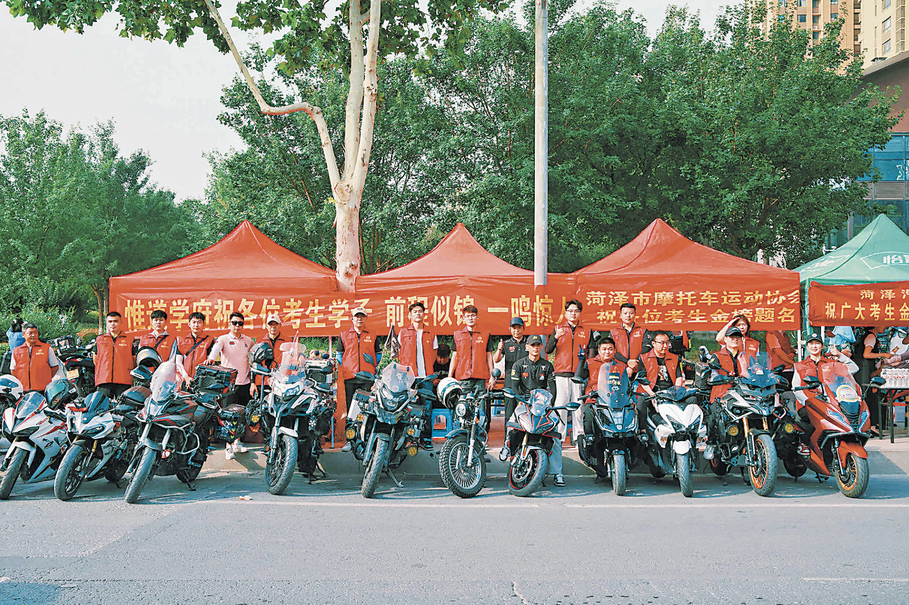 菏澤市摩托車運動協會的“摩友”在考點外守候。