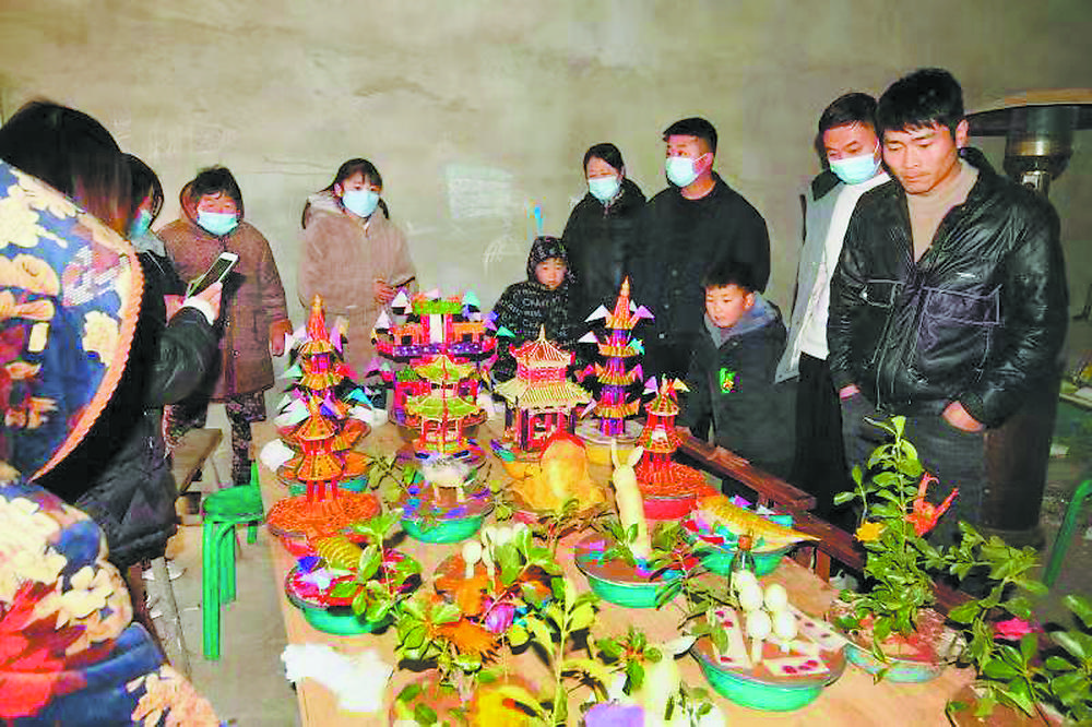 花供的傳統塑法有多種,有生面塑、熟面塑,膠泥捏制而成的,并施以彩繪;也有用蘿卜、水果等其他材料制作的。栩栩如生的十二生肖、壽星、龍鳳等吉祥物,都是農戶手工制作而成。莊寨鎮南街村村民任憲德告訴記者:“2023年是兔年,我特意用面粉做了兩只兔子,寓意兔年吉祥、大吉大利。”