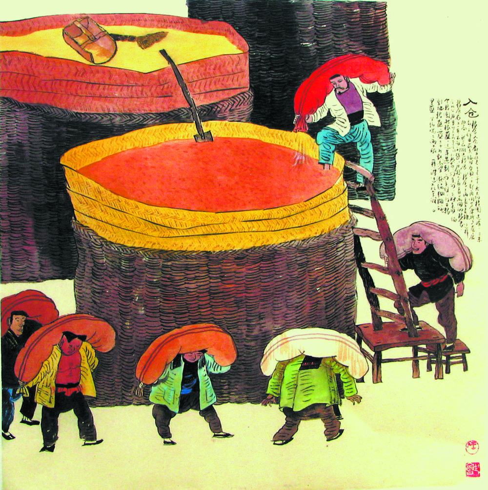 最考驗人氣力的還是交公糧,公社倉庫的糧倉高四五米,交糧人要扛著布袋,踩著窄窄木板爬到倉頂,把糧食倒下。也有身材單薄的漢子,扛個百多斤的布袋就費勁,走在木板上晃悠悠的,很是膽怯。也有站不穩翻倒在旁邊的糧堆里,引得周圍人的一陣嘲笑。
