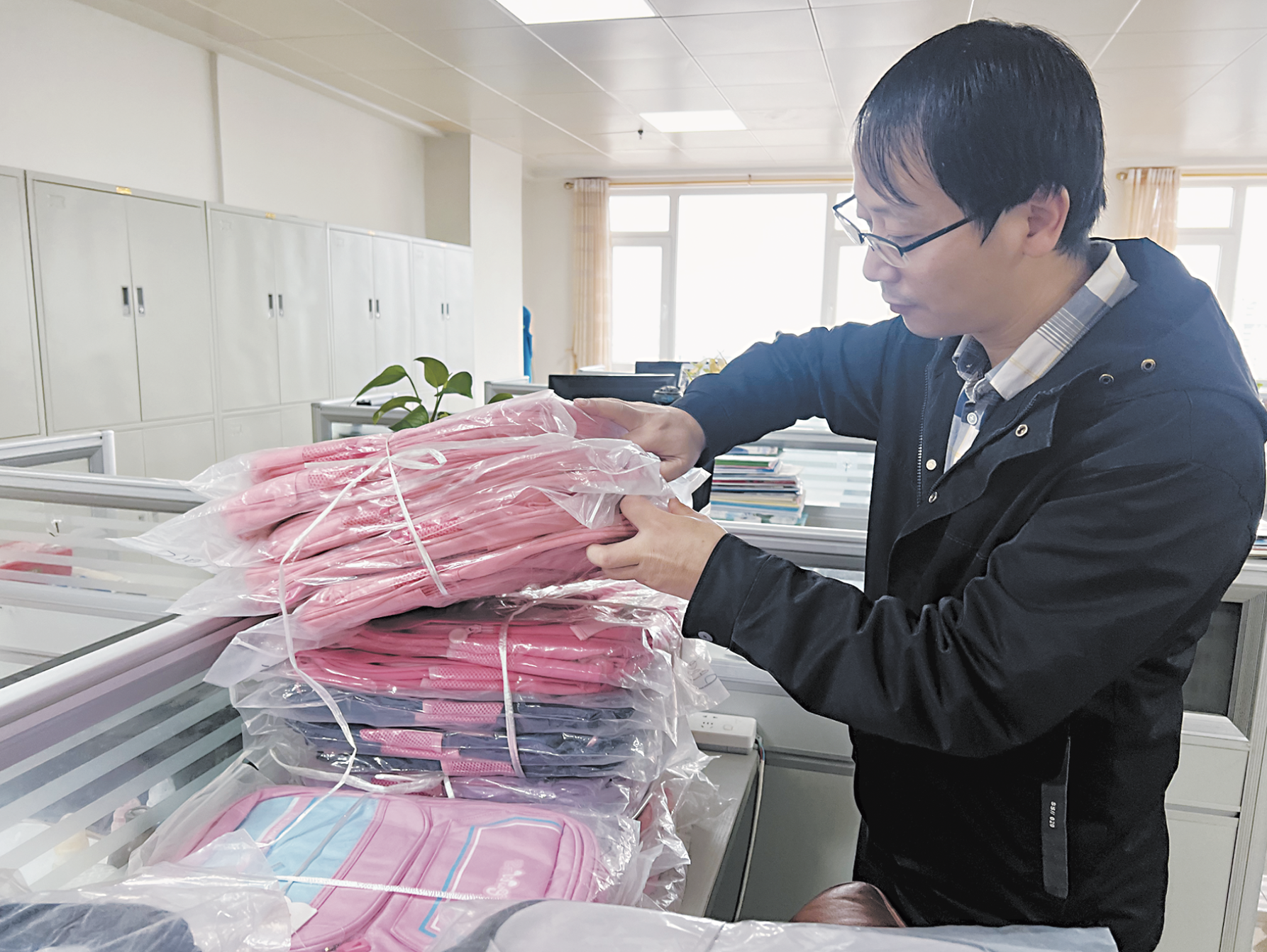 右上圖:菏澤財(cái)金經(jīng)濟(jì)發(fā)展有限公司工作人員將100個(gè)愛(ài)心書(shū)包送到菏澤日?qǐng)?bào)社。