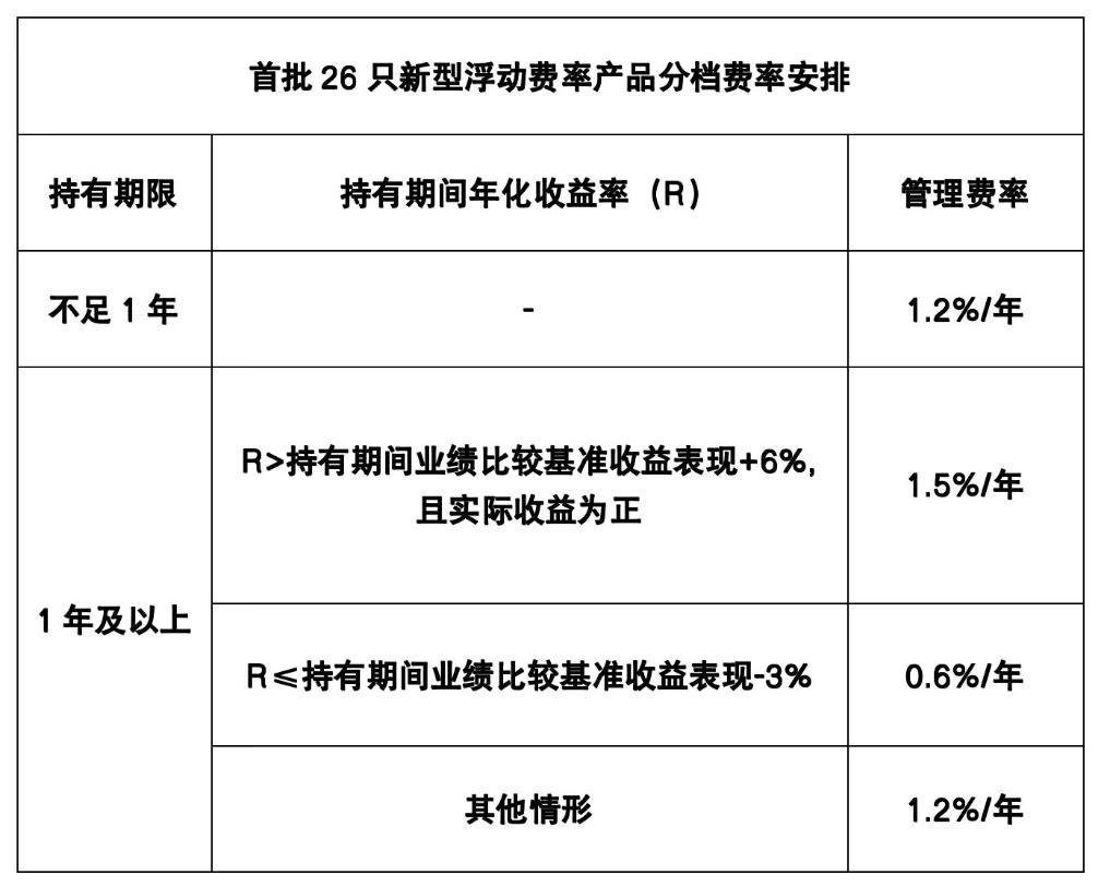 首批產(chǎn)品均設(shè)置了1.2%(基準(zhǔn)檔)、1.5%(升檔)、0.6%(降檔)三檔費(fèi)率水平。投資者持有一年以后贖回產(chǎn)品時(shí),基金管理人將會(huì)根據(jù)產(chǎn)品年化收益水平與業(yè)績比較基準(zhǔn)的對(duì)比情況,來計(jì)提不同檔次的管理費(fèi)。