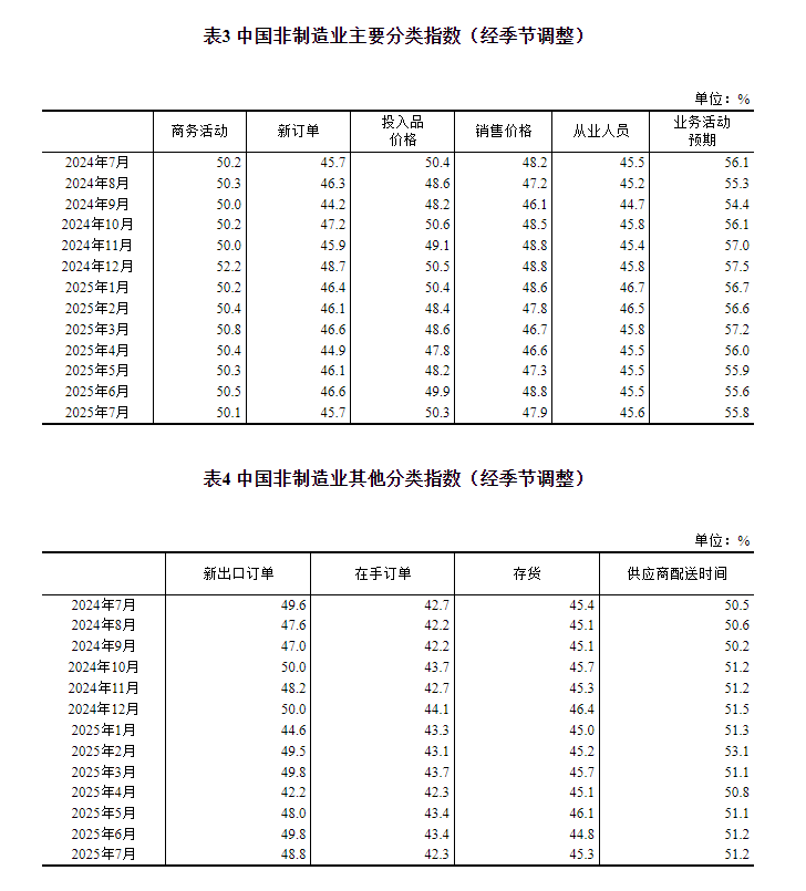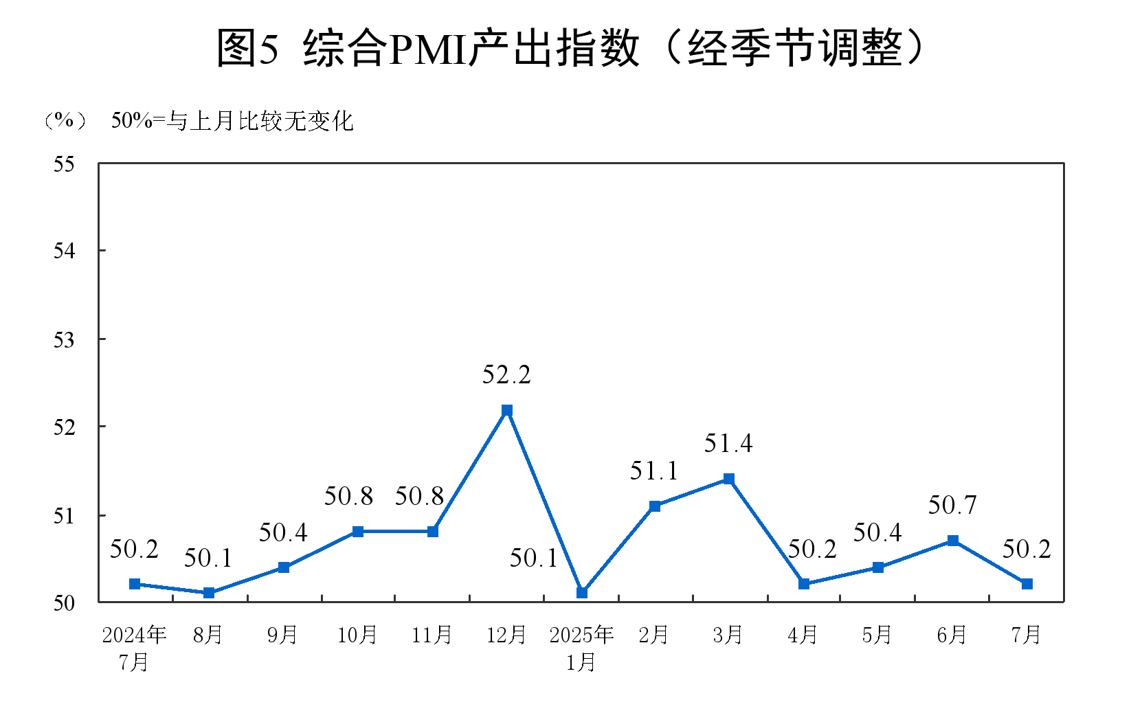 7月份,綜合PMI產出指數為50.2%,比上月下降0.5個百分點,仍高于臨界點,表明我國企業生產經營活動總體保持擴張。