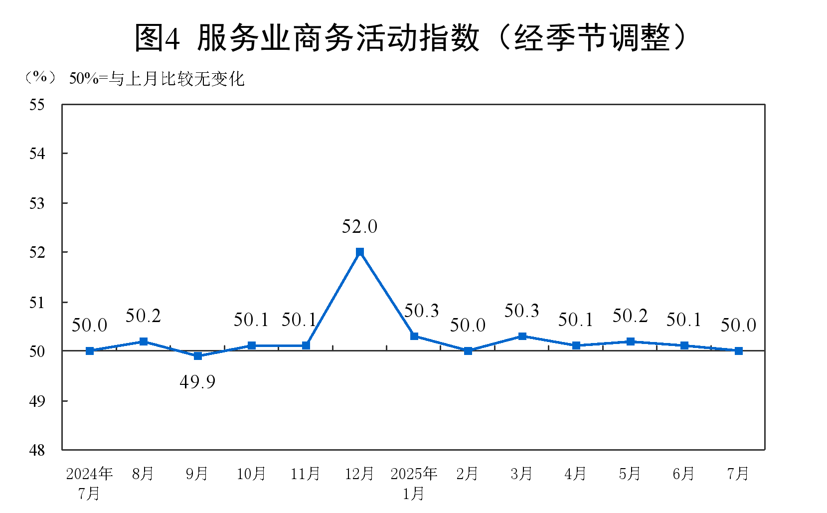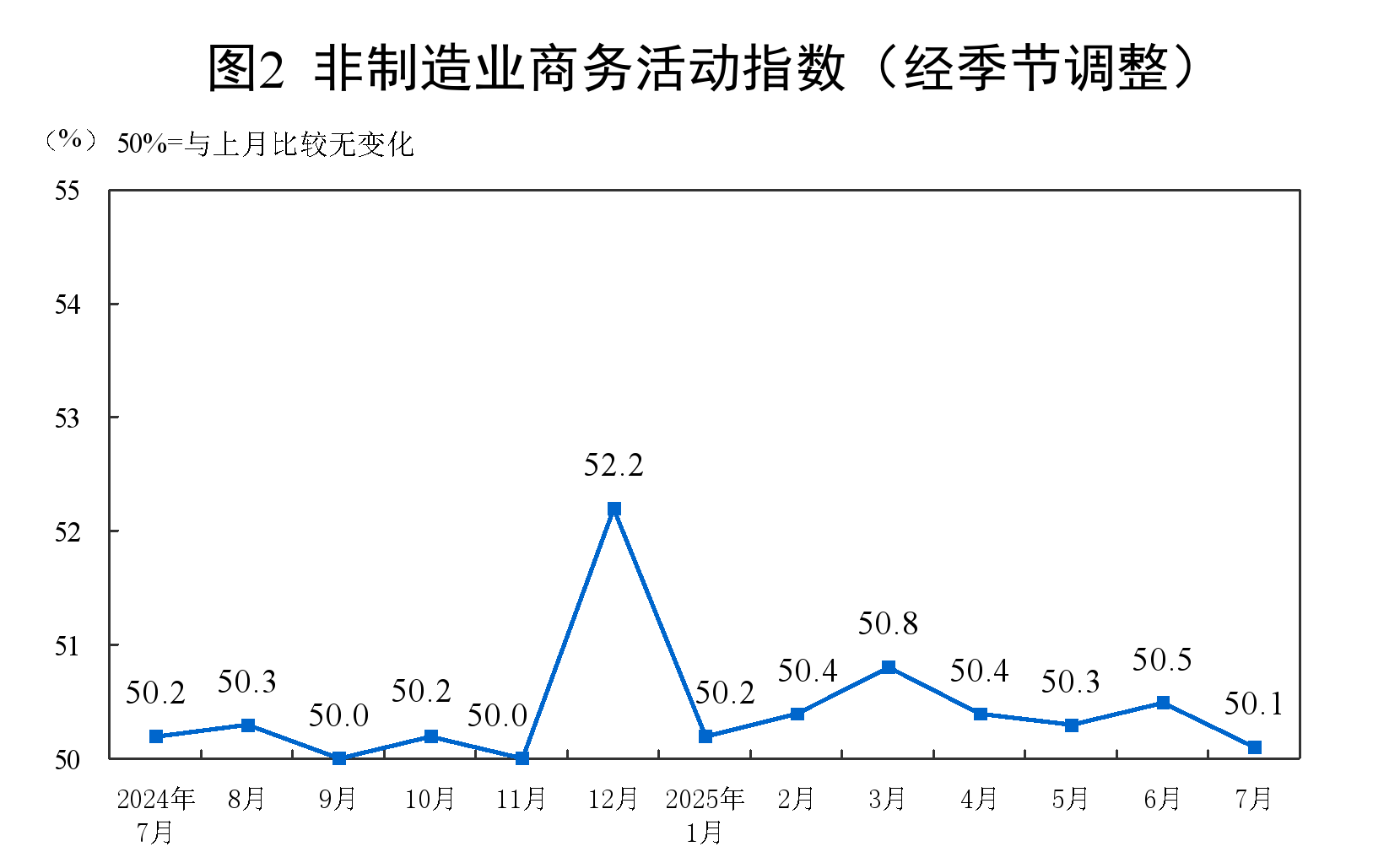 7月份,非制造業商務活動指數為50.1%,比上月下降0.4個百分點,仍高于臨界點。