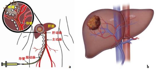 我們知道,人體的各個器官,都需要血液提供營養,而肝癌同樣需要血液提供營養。TACE是在X線透視下,通過穿刺股動脈或橈動脈,將導管沿著血流管道插到腹腔干動脈直至肝動脈,然后通過肝動脈向腫瘤營養動脈注入化療藥物及栓塞劑,發揮阻塞血管及局部化療作用,“斷其糧道,餓死腫瘤”,導致肝臟腫瘤壞死(如圖1a所示)。TACE為了殺死腫瘤細胞,把肝臟的動脈血管堵上了,正常肝臟不會缺血壞死而受影響嗎?實際上,TACE治療肝癌的核心原理是肝臟具有肝動脈和門靜脈雙重供血,肝癌組織的血供95%以上來自肝動脈,而正常肝臟組織的血供70%-75%來自門靜脈,因此,栓塞供應肝癌組織的肝動脈分支可有效阻斷腫瘤的血供并使其縮小壞死,而對正常肝臟組織影響較小(如圖1b所示)。
