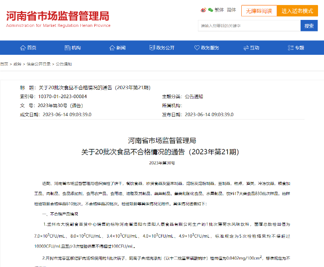河南省市場監督管理局針對抽檢發現的問題,對于不合格樣品涉及外省生產單位的,已按規定移送相應省級食品監管部門進行調查處理;對于不合格樣品涉及省內生產經營單位的,已要求鄭州、開封、洛陽、新鄉、焦作、許昌、三門峽、商丘、周口等地市場監管部門對涉及單位依法處理,責令查清不合格產品的批次、數量、流向,召回不合格產品,采取下架等措施控制風險,分析原因進行整改,并依法予以查處。