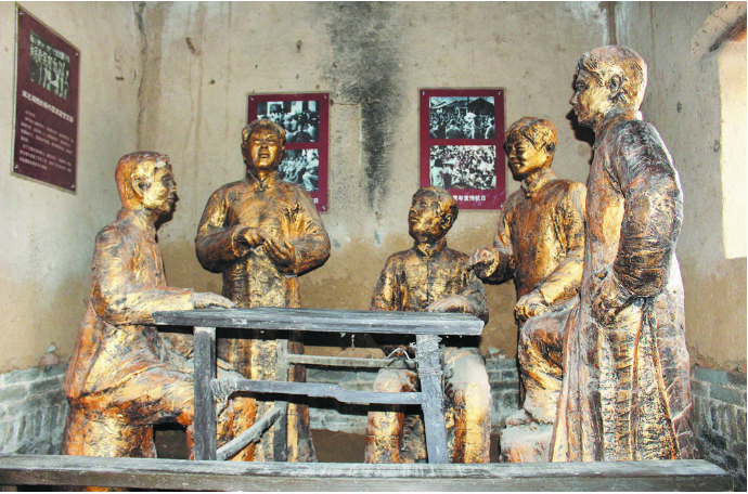 袁心來興致勃勃地帶領(lǐng)記者參觀村里的金曹縣抗日民主政府舊址。高大古槐掩映下的古樸院落,顯得格外幽靜。走進修繕的老屋里,一座銅色群雕首先映入眼簾,5個壯實人物的英雄形象,令人肅然起敬,或講述、或聆聽、或沉思,無所畏懼、豪邁坦蕩的神情凝在聚每個人物的臉龐。袁心來講解道:“這是中共單東北第一個農(nóng)村黨支部成立的地方,再現(xiàn)的是楊作磊家庭黨支部會議的情景,站著講話的就是黨組織的創(chuàng)始人楊作磊……”