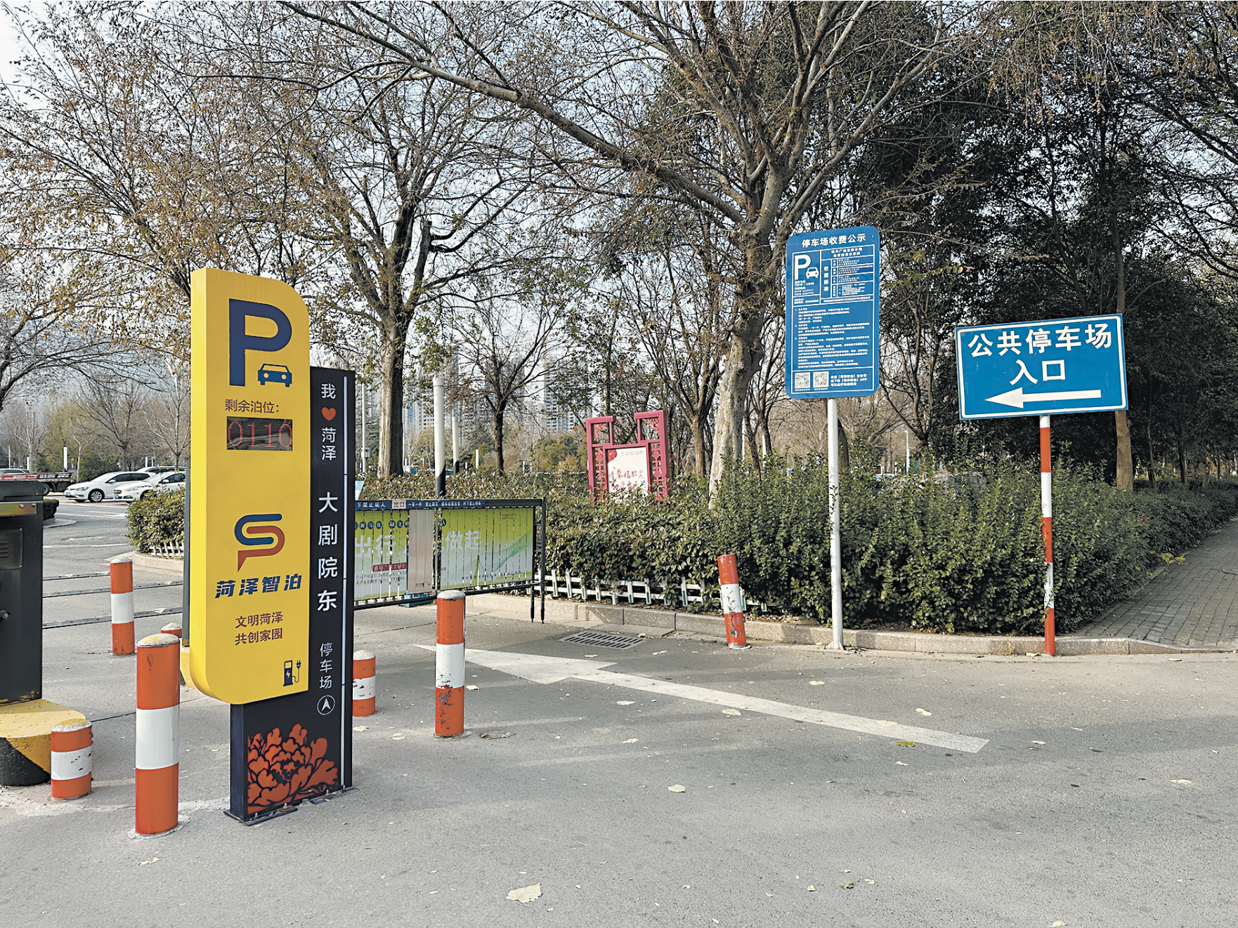 12月11日14時許,在菏澤大劇院東停車場入口處,一塊黃色余位屏顯示該停車場的剩余泊位還有110個。