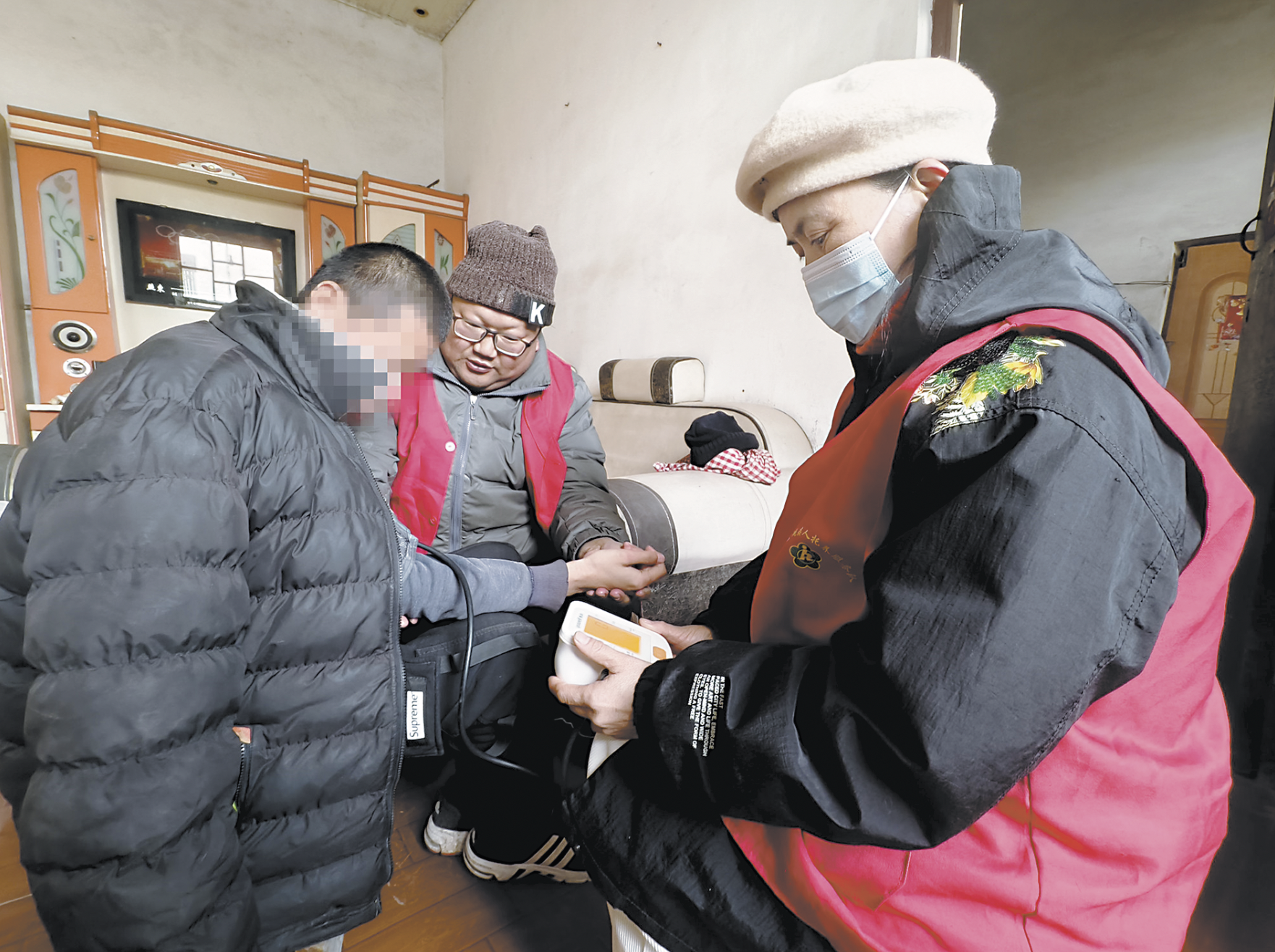 “光光,最近怎么樣?咱們脫掉這個胳膊上的外套,我給你測量血壓。”12月19日,牡丹區殘疾人托養服務隊隊員王雷、李秋芹挎著工具包,輕車熟路地走進殘疾人李光家,熱情地打招呼后,就麻利地忙了起來。