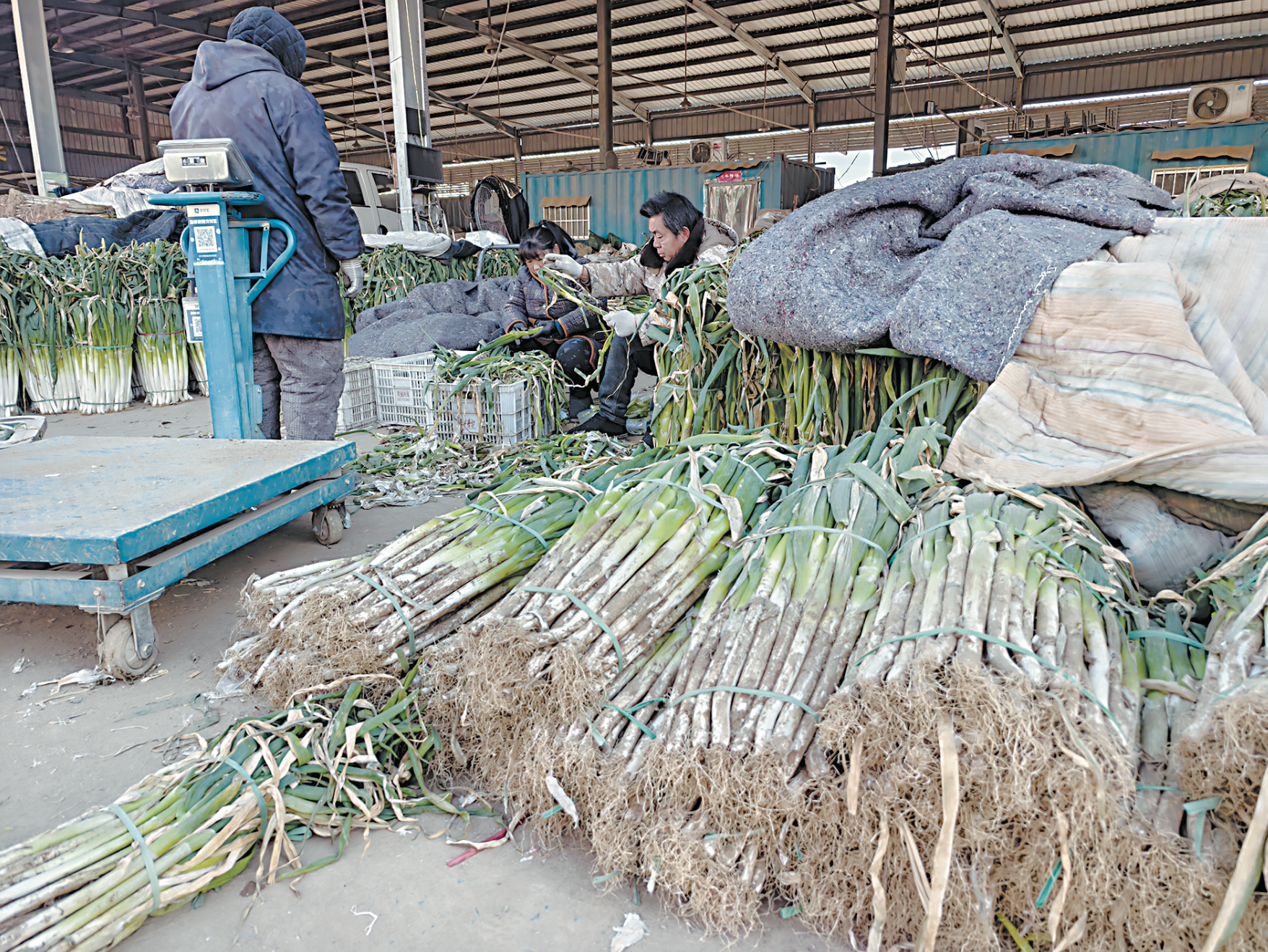 在一家專賣娃娃菜的攤點處,八九名工人忙著將娃娃菜去葉,然后整齊碼放在筐里。另外一家商戶銷售土豆,工人們按照規格大小將成堆的土豆分類裝筐,專門的運輸人員將成箱的土豆裝車后,及時為客戶送貨上門。“春節越來越近,我們準備了充足的大蔥,春節包包子、包餃子、做菜都少不了。大蔥還比較容易存放。最近訂購的商販逐漸增多,大蔥銷量有所增加。”專做大蔥生意的王先生說,隨著春節越來越近,市場越來越熱鬧。
