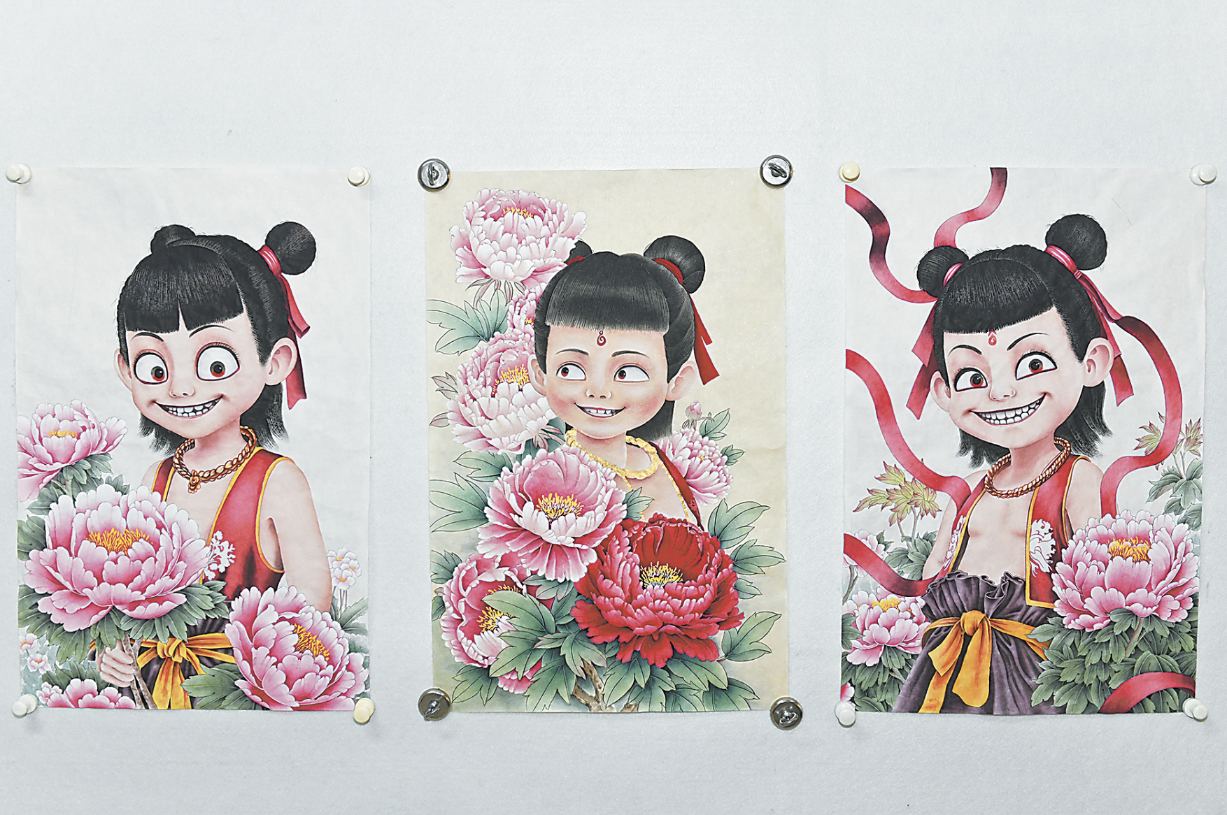 目前完成的三幅畫作中,身著紅綾的哪吒身處魏紫姚黃之間,與綻放的牡丹嬉戲,工筆牡丹層層暈染形成的立體質感與動漫人物凌厲的線條形成美學張力。傳統藝術需要與時代共鳴,當哪吒的俏皮可愛與牡丹的雍容華貴,通過畫家的藝術創作在宣紙上和諧共生,搭乘國潮IP的東風,工筆牡丹畫跨越山海、走向世界。目前,該系列仍在持續創作中。