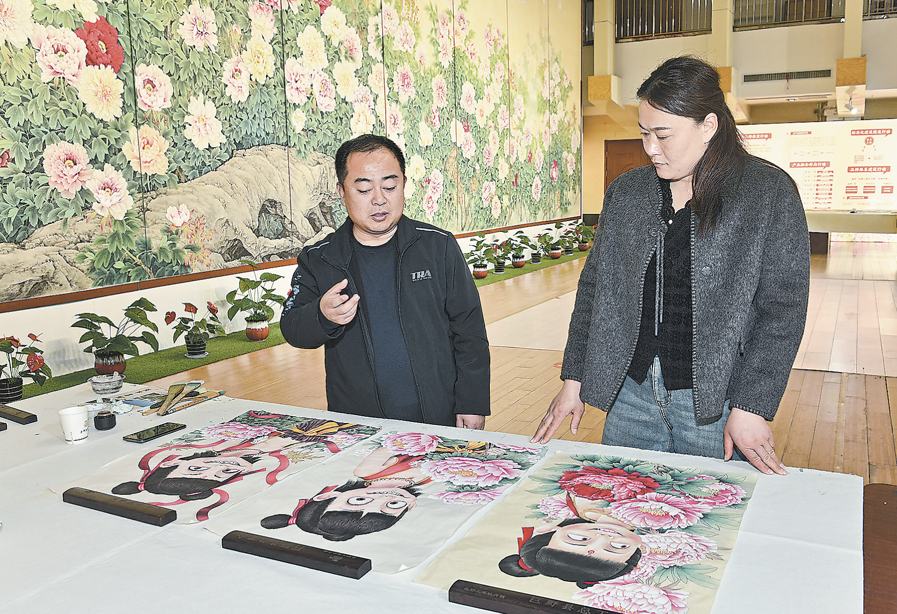 談及創作靈感,侯福常表示,當國產動畫電影《哪吒之魔童鬧海》票房突破百億元大關時,便想著將傳統工筆牡丹技法與國漫頂流IP創新融合?!拔颐晌也挥商臁钡哪倪笌訃鋈?,而巨野工筆牡丹畫承載著花開盛世的美好寓意,二者碰撞必將產生奇妙的化學反應。