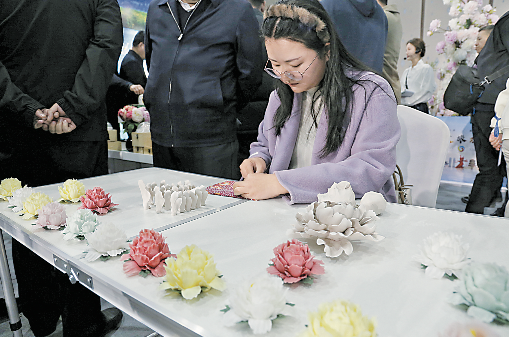 步入文旅展區,空氣中彌漫著淡淡的花香,以牡丹為靈感設計的文創產品琳瑯滿目。展臺上,印有工筆牡丹紋樣的文創產品、釉色流動的牡丹紋瓷器、衣袂飄飄的曹縣漢服以及水滸文化演出,吸引了眾多市民駐足欣賞。千年文化底蘊與當代創意設計碰撞,牡丹文創、曹縣漢服、巨野工筆牡丹畫等文化IP引爆了消費熱潮,使文旅展區成為市民打卡的“頂流”。