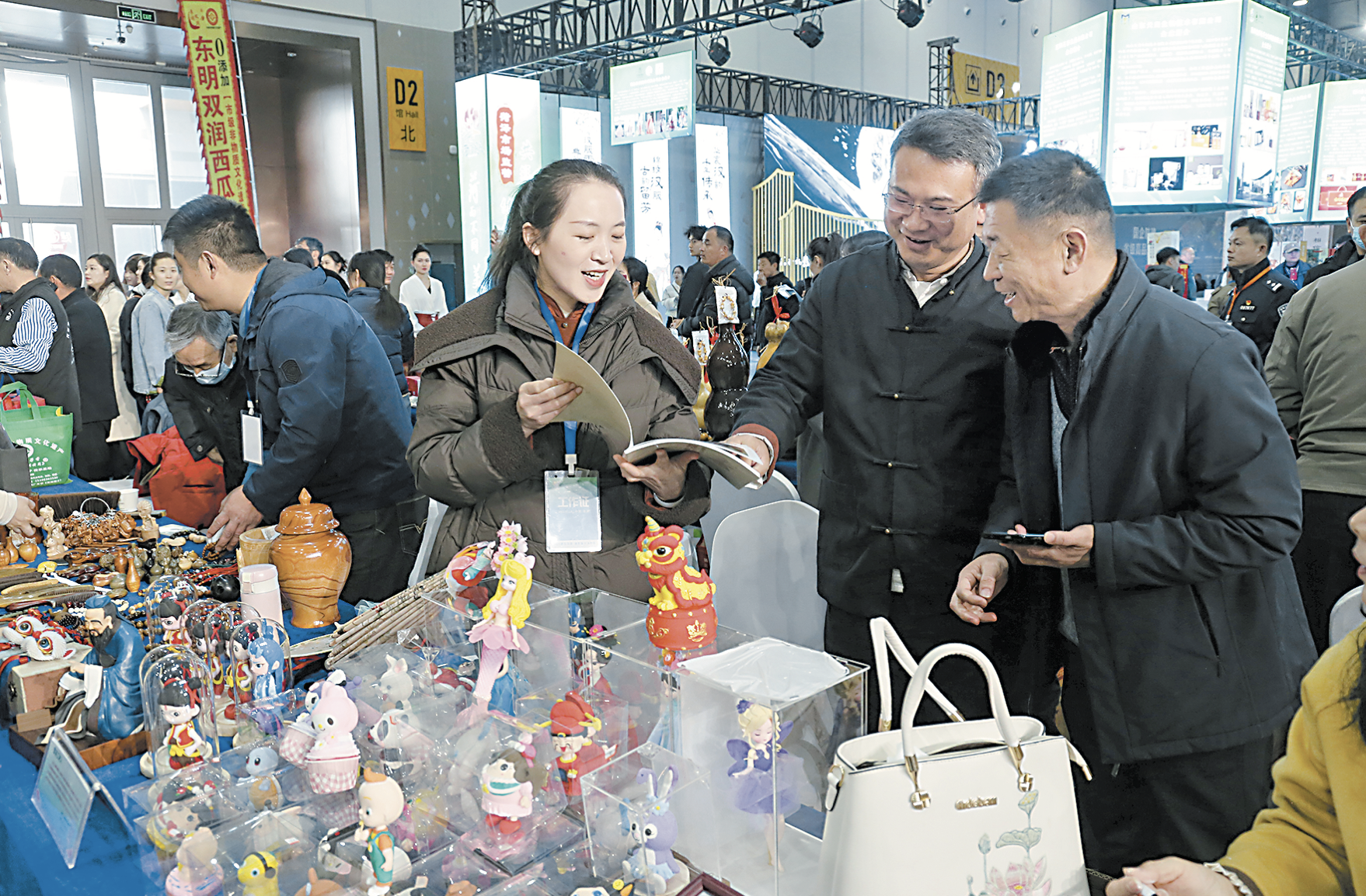 文旅展區采用開放式布局,分為四個板塊,全面展示了菏澤市文旅產品資源和文旅發展成果,釋放了文旅消費的潛力?!皶秤魏蕽伞卑鍓K重點展示了曹州牡丹園、水滸好漢城、老城曹州等8個熱門A級景區和省級旅游休閑街區的基本情況、特色活動及惠游政策;“魅力非遺”板塊邀請了22個廣受歡迎的非遺代表性項目和產品進行現場展示展銷;“品牌國潮”板塊組織了市文旅集團、牡丹區寫意牡丹畫院、曹縣有愛共創漢服直播基地、巨野書畫院、鄄城“精一坊”魯錦、東明糧食畫等6家文旅企業(單位)展示新推出的國潮新品;“特色活動”板塊則由參展景區、國潮產品企業、非遺代表性項目傳承人等開展妝造巡游、演藝宣推、直播帶貨、集章打卡、非遺傳承體驗等主題活動,進一步增強了展區的參與性、體驗性和趣味性。