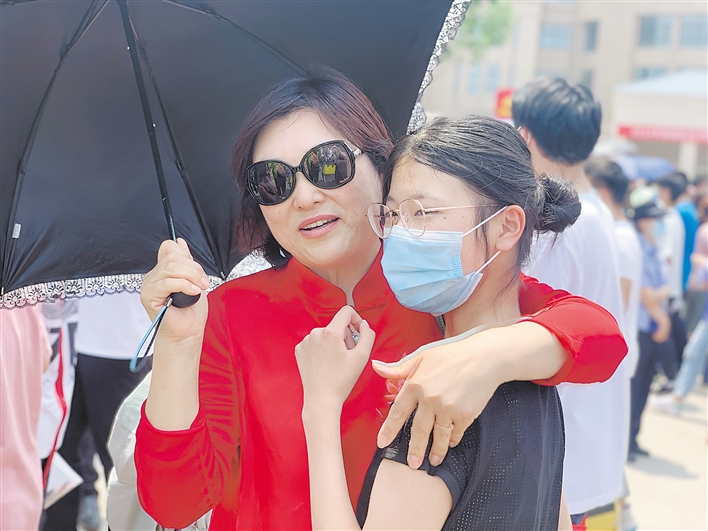 11點30分,伴隨著清脆的鈴聲響起,2020年夏季高考首場考試正式結束。考生走出考場,在外等候的母親為剛考完的孩子擦拭額頭的汗水,撐著遮陽傘的父親為孩子遞上水杯……