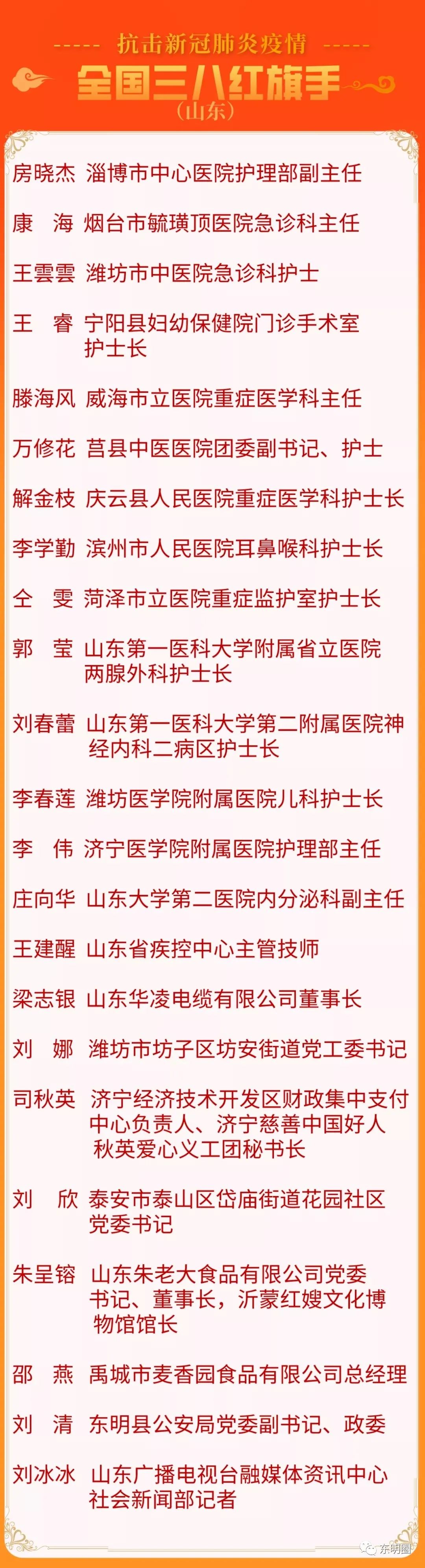 9月29日,抗擊新冠肺炎疫情全國三八紅旗手(集體)表彰云發布活動在京舉行。活動以“弘揚偉大抗疫精神 唱響新時代頌歌”為主題,發布了800名抗擊新冠肺炎疫情全國三八紅旗手和200個抗擊新冠肺炎疫情全國三八紅旗集體。 其中,菏澤市立醫院重癥監護室護士長仝雯、東明縣公安局黨委副書記、政委劉清受到表彰。