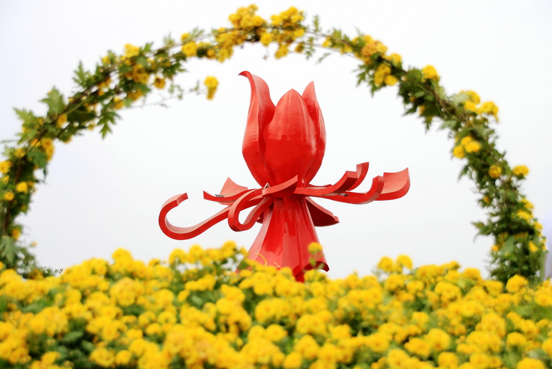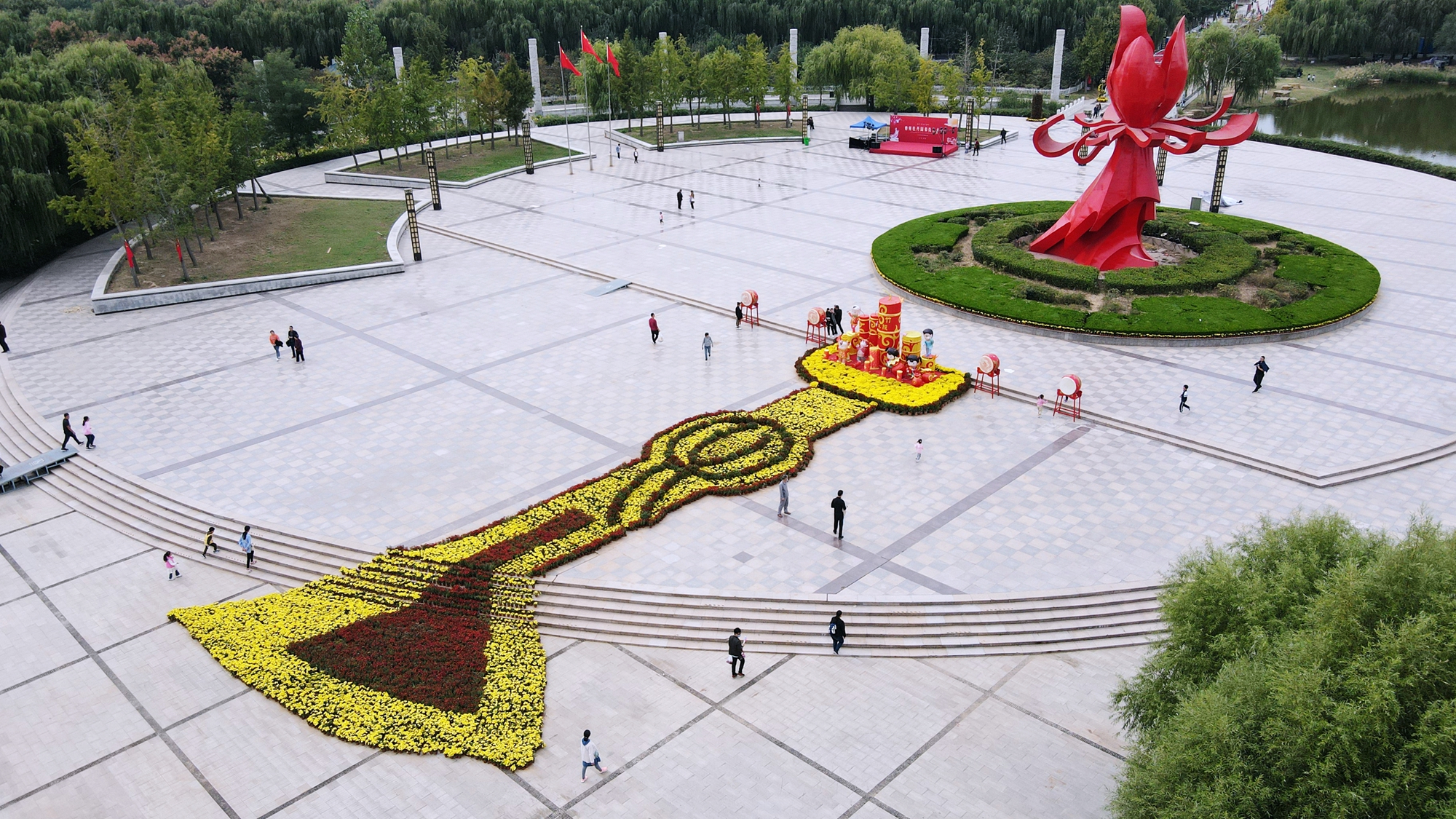 五大展區(qū)具體為:“牛氣沖天”展區(qū),以菊牛造型迎接八方游客,寓意中華民族日益強大,牛氣十足;“繁榮昌盛”展區(qū),以國花魂為背景,擺設(shè)大型花壇,花團錦簇,寓意國富民強;“龍鳳呈祥”展區(qū),以國花門為中心,東、西兩側(cè)的龍鳳造型及花廊,寓意龍鳳呈祥,祝福祖國人民吉祥安康;“太平盛世”展區(qū),以觀花樓為中軸線,擺放大型鐵藝造型、草編花瓶及九龍壁,寓意國泰民安,太平盛世;“花好月圓”展區(qū),以西門牡丹鼎為背景,擺放月彎草編造型,寓意中秋節(jié)花好月圓。