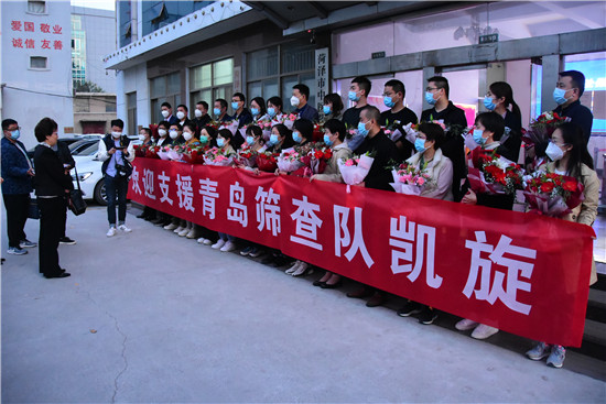 在迎接儀式上,侯婕代表市委市政府,向28名隊(duì)員圓滿完成支援青島篩查任務(wù)凱旋表示衷心感謝和熱烈祝賀,同時(shí)向一直關(guān)心和支持隊(duì)員們的后方單位和他們的家人表示感謝和慰問。
