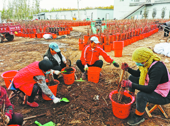 菏澤市上海路附近一催花基地內(nèi),工人正在為催花牡丹裝盆。