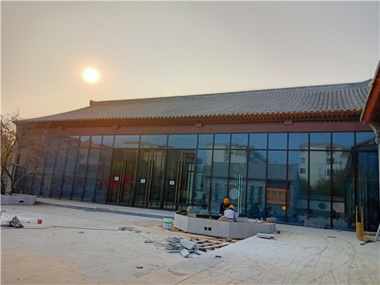 從廣福大街與曹州路路口西側(cè)進(jìn)入施工區(qū),東南角是正在建設(shè)的展示中心。從外部看,展示中心為園林院落式建筑,其外部裝修已經(jīng)基本完成。從圓形門廊處進(jìn)入院內(nèi),可見(jiàn)兩側(cè)展廳的正面是玻璃幕墻,其余墻體為灰白磚樣式,整體形成現(xiàn)代與復(fù)古風(fēng)格結(jié)合的建筑美感。
