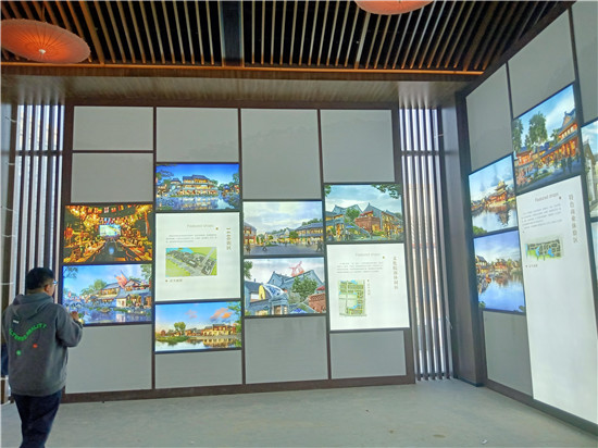 展廳內(nèi)部,墻壁展示布置已基本完成,數(shù)名施工人員正在進(jìn)行收尾工作。布展內(nèi)容圖文并貌,展現(xiàn)了菏澤城市的人文歷史及風(fēng)土民情發(fā)展脈絡(luò)。展廳內(nèi)還設(shè)有游覽體驗(yàn)區(qū)和巨屏演播區(qū),游覽體驗(yàn)區(qū)的座椅及播放設(shè)備尚處于調(diào)試階段,巨幕演播區(qū)有兩塊巨幕組成,可展演曹州古城的演變及保護(hù)性開發(fā)的理念和設(shè)計(jì)效果。