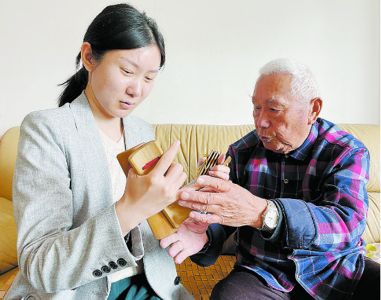 之后,陳龍接過(guò)田超贈(zèng)予的竹板,跟隨老師演出。他邊觀(guān)看邊模仿,遇到“坎兒”就請(qǐng)教,師徒樂(lè)教樂(lè)學(xué),共同進(jìn)步。