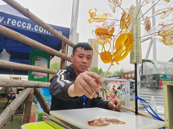 生動形象的面塑、活靈活現的糖畫、精美絕倫的手編……在曹州牡丹園,記者看到各個非遺攤位前擺滿了一件件制作精湛的非遺作品,不時引來游客駐足觀看。面塑藝人時海峰告訴記者,他們這些民間藝人均為菏澤市民間文藝家協會會員,在牡丹花開的季節里,分散在曹州牡丹園內進行藝術創作,向廣大市民及外地游客展示菏澤民間工藝風采。
