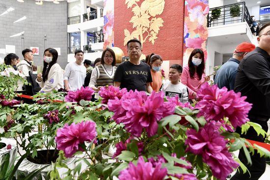 4月10日, 游客在曹州牡丹園國花館內欣賞精品盆栽牡丹。最美四月天,菏澤各大牡丹觀賞園的牡丹如約綻放,花開成海,滿城飄香。來到菏澤,除了能欣賞室外盛開的大田牡丹花海,也能品鑒姹紫嫣紅的精品盆栽牡丹。記者 張嘯 攝