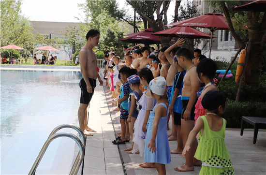 7月24日上午,“泳抱湛藍”——2021中達綠城·江南里“海豚計劃”啟動儀式舉行。據了解,“海豚計劃”是綠城園區生活服務的重要活動之一,旨在讓所有綠城小業主都能學會游泳,掌握一項生存技能。13年來,全國共有70余座城市、170多個園區、15萬名小業主學會了游泳。物業負責人李慶坡介紹,培訓期間,他們將在園區大門防衛、社區泳池的安全看護、淋浴間看護等全程為小業主提供服務,特別是會嚴格對泳池每日消毒檢測、保證水溫等各項指標安全,并做好環境衛生清理及消殺防疫等工作。圖為中達綠城·江南里小業主認真聽教練講解游泳注意事項。記者 李亞楠