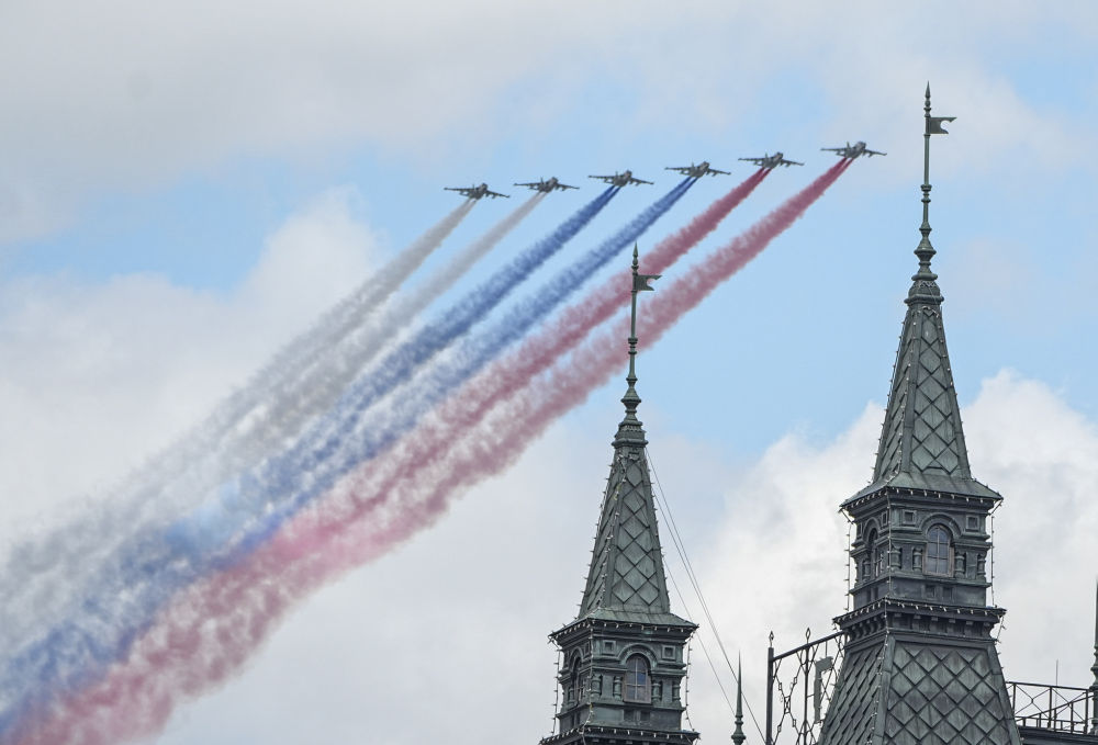 ??5月9日,在俄羅斯首都莫斯科,參加紀念蘇聯偉大衛國戰爭勝利80周年閱兵式的戰機編隊拉煙飛行。新華社記者 賴向東 攝