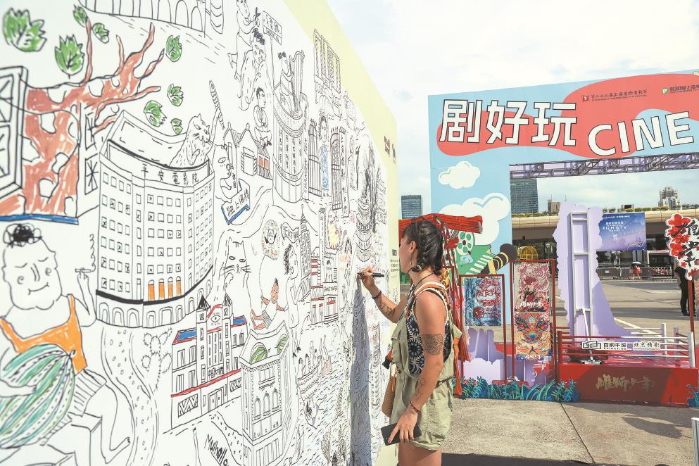 胡子拉碴的警員阿Sir、動畫電影《馴龍高手》中的無牙仔、充滿懸念的“醬園弄現場”……在上海展覽中心,立有一塊由插畫師Rosá玫瑰與市民共創的“我的電影故事”畫板,一筆筆手繪中埋下很多城市彩蛋與弄堂故事,更有影迷在空白插畫區記錄下自己的“私影史”。畫板右上角有一處方方正正的電影院簡筆畫,連進場路線都用火柴人標注清楚,Movieland小程序工作人員韓語指著這處手繪告訴記者:“一位影迷過來,說‘怎么能沒有我們滬北電影院呢?我也要畫一個’,他就趴在畫板畫了快半小時,昨天太陽那么大,背都曬紅了。”
