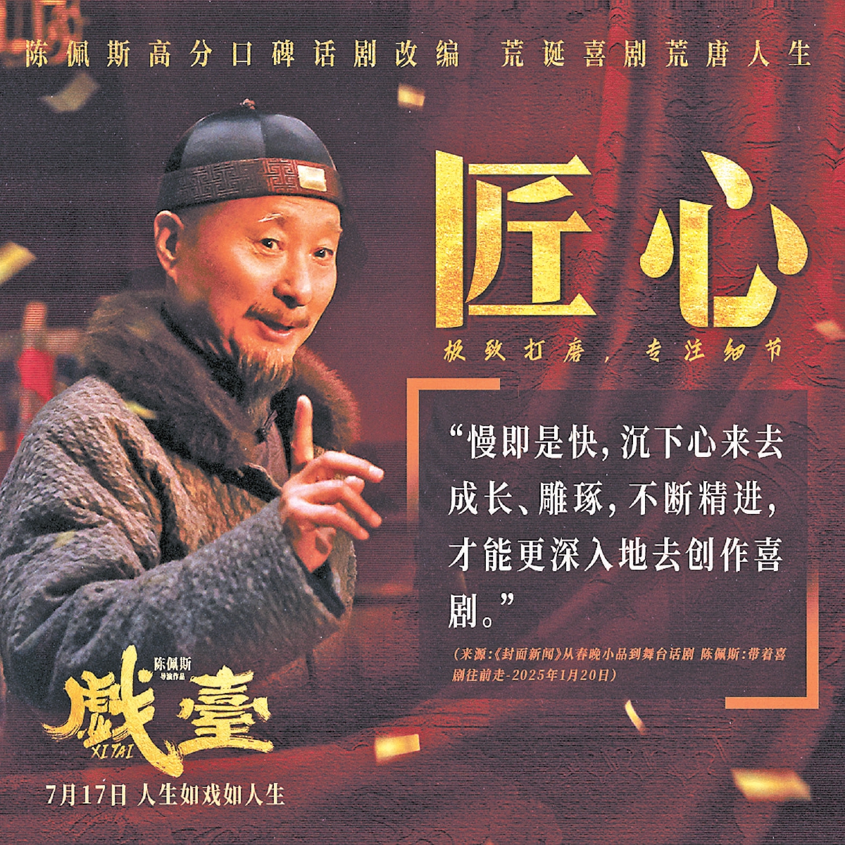 “戲是演給人看的,可劇場裝不下所有想看的人。”在電影《戲臺》發布的“嬉笑怒罵皆風骨”陳佩斯特輯中,陳佩斯這句話揭開了他將《戲臺》從話劇舞臺搬上銀幕的初心。從春晚舞臺為千家萬戶帶來笑聲,到如今為話劇和電影奔忙,陳佩斯對表演的熱愛幾十年如一日,始終保持著孩子般的純粹、真誠和求知欲,而這也奠定了電影《戲臺》的品質,影片由陳佩斯、黃渤、姜武、尹正領銜主演,楊皓宇特邀主演,余少群、陳大愚、徐卓兒主演,尹鑄勝友情出演,將于7月17日全國上映。