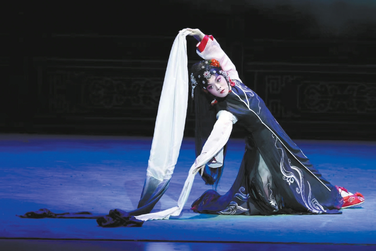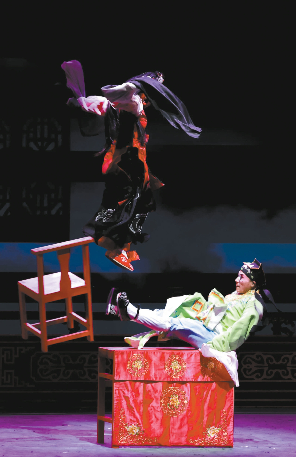 該劇技巧自然是上難度又有特色,且難得都是用傳統(tǒng)道具而技巧出新:一是旦角立于兩腿翹起的椅子的橫棖上,丑角拖著椅子原地旋轉(zhuǎn),兩人配合做出各種身段;一是“桌上踹凳”,椅立桌上,丑角從下長門起跑橫踹,旦角凌空跳起,椅子落地,旦角穩(wěn)穩(wěn)落于桌面。不過更值得一說的是,“活捉”中閻惜嬌這一角色,情癡又決絕,各劇種前輩演員對其情緒的開發(fā)已臻“像素級”。而鮑陳熱的閻惜嬌通過水袖的開合、蘭花指的運用,給閻惜嬌帶上了一種貓科動物的軀體特征,讓她的時而嫵媚時而狠厲也有了別樣的風(fēng)情。讓人物比技巧更有記憶點,真是不易,也讓人對她將在國家大劇院為北京觀眾帶來的演出充滿了期待。