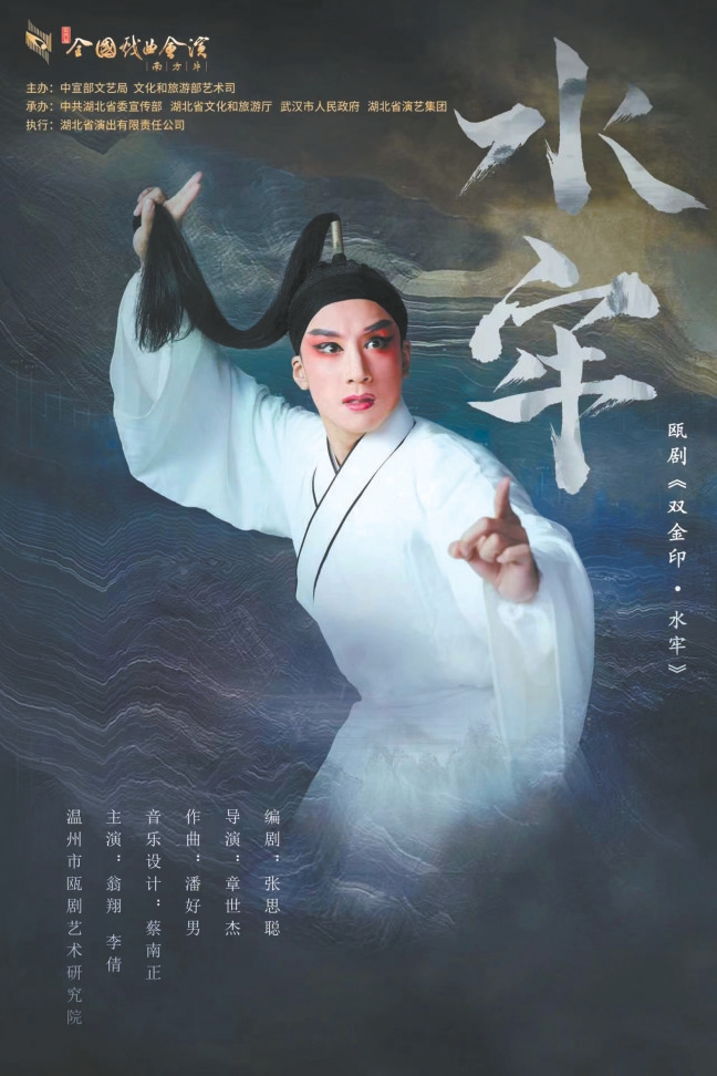 如果說臺州亂彈這一折的創(chuàng)新尚在戲曲的“規(guī)矩”之內(nèi),甌劇的創(chuàng)新就有些“出格”了。《雙金印·水牢》一折中有大量表現(xiàn)劇中人物在水里行走、站立艱難的身段,并不是完全來源于戲曲,像是從現(xiàn)代舞中有所借鑒。更有甚者,表現(xiàn)貼墻潛行的段落,使出了霹靂舞的經(jīng)典動作“擦玻璃”。這場演下來現(xiàn)場觀眾彩聲不斷,觀演氣氛極好,但我個人總覺得演員還有點兒“食而不化”,大量借鑒來的身段對生活場景的模擬過于具體,與他穿插其中的抽象戲曲程式并不能很好地融合,審美也因此顯得割裂。