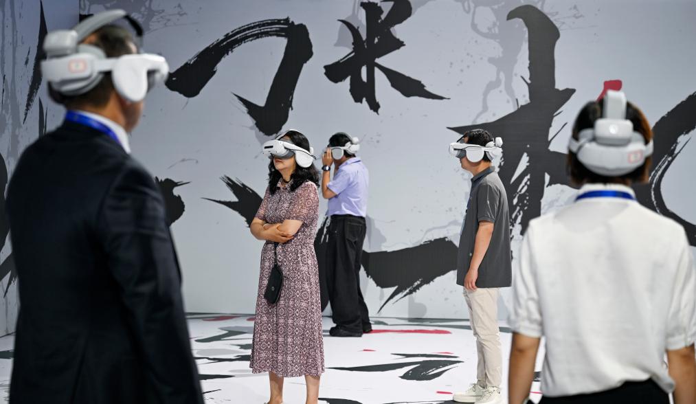 7月4日,重慶市永川國(guó)際會(huì)展中心,嘉賓在現(xiàn)場(chǎng)體驗(yàn)中國(guó)電影科技企業(yè)的虛擬影片。(陳誠(chéng) 攝)