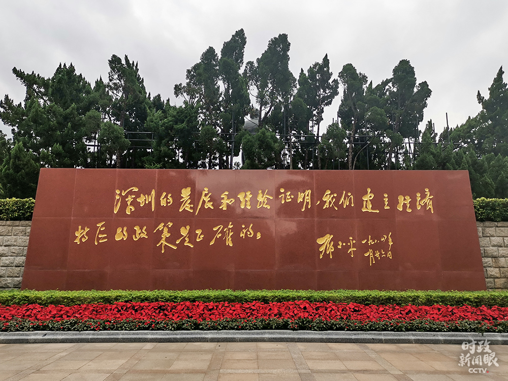 鄧小平銅像北側是一塊長達13米、高4.35米的花崗巖石墻,石墻北面鐫刻著鄧小平同志1984年視察深圳時的題詞:“深圳的發展和經驗證明,我們建立經濟特區的政策是正確的。”(總臺央視記者王冰拍攝)