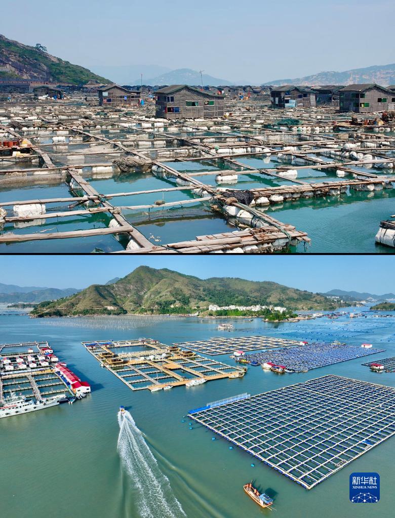拼版照片:上圖為2007年7月拍攝的福建寧德三都澳海域傳統漁排(資料照片);下圖為2023年11月18日拍攝的福建寧德七星海域升級改造后的漁業養殖區(無人機照片,新華社記者姜克紅攝)。新華社發