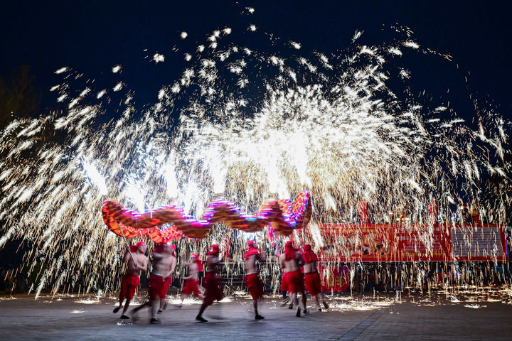 民間藝人在河南省洛陽市2024隋唐河洛文化廟會上表演打鐵花(2024年2月14日攝)。新華社發(李衛超攝)