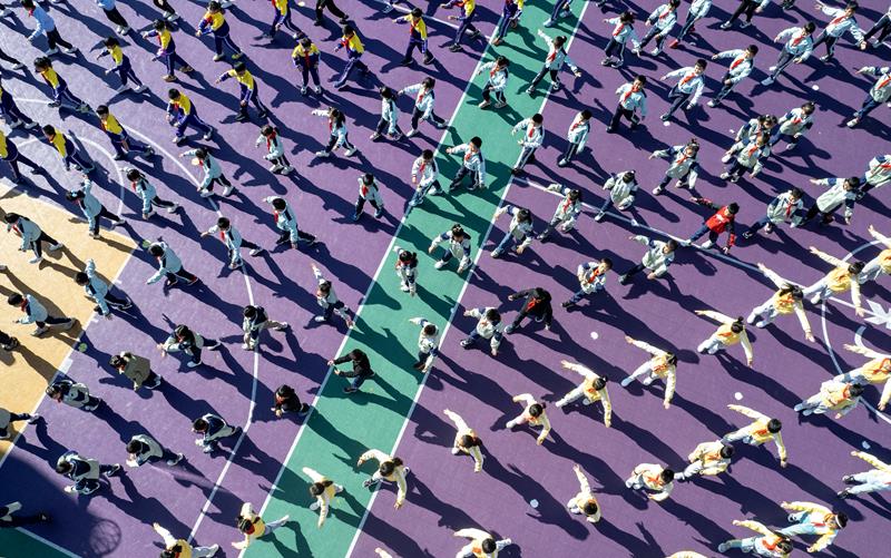 △2025年2月28日,云南昆明金康園小學學生在操場上做課間操。