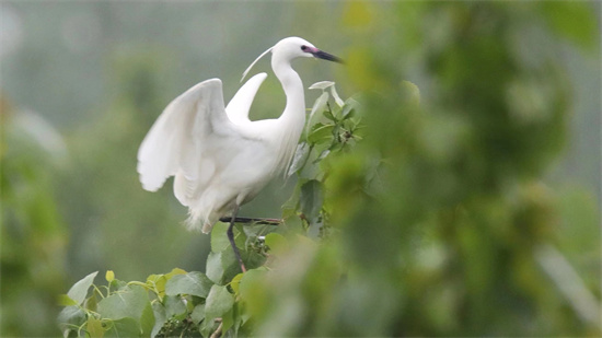 4月13日下午,春雨霏霏,記者慕名來到曹縣魏灣鎮張康村觀鳥拍鷺基地。沿著步梯登上25米高的觀鳥塔,放眼四周,只見高大的楊樹、槐樹樹林梢間,成百上千只白鷺在林間樹枝上群居、棲息、飛翔。有的在雨中默默靜立,盡享春雨的愜意;有的在巢內悉心呵護著幼鳥、鳥蛋,洋溢著溫馨的氣息;有的在枝頭振翅欲飛,撲閃美麗的羽翼;有的在空中展翅翱翔,搏擊晚春的風雨。瀝瀝春雨,悅目白羽,讓人不由沉浸在這無限的春色、葉綠鳥鳴里。