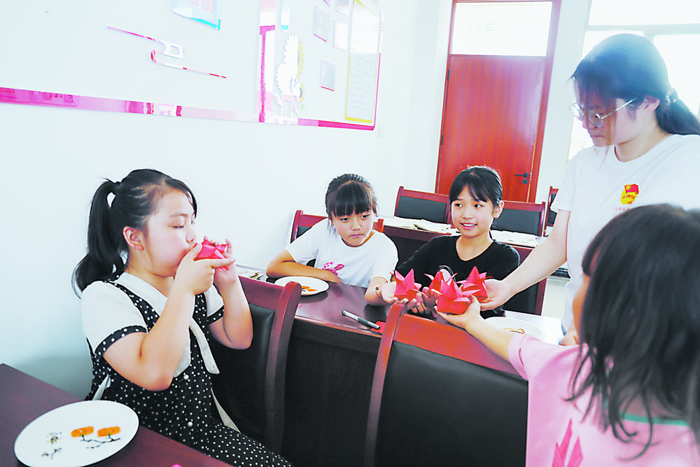 “貼上一朵小紅花,看看漂亮不漂亮?”7月19日,在東明縣長興集鄉(xiāng)興東新村“小荷學(xué)堂”上,十余名孩子正在大學(xué)生志愿者的帶領(lǐng)下上折紙手工課。