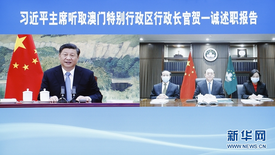 1月27日,國(guó)家主席習(xí)近平在北京以視頻連線方式聽取了澳門特別行政區(qū)行政長(zhǎng)官賀一誠(chéng)2020年度的述職報(bào)告。新華社記者 王曄 攝