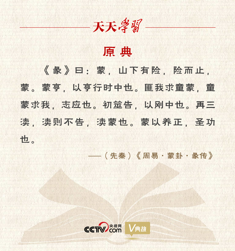 “蒙以養(yǎng)正,圣功也”出自《周易》蒙卦的彖辭。兒童出生后知識未開,對世界還懵懵懂懂,所以叫作“蒙童”。培養(yǎng)蒙童使之接受教育走上正道,成為對社會有用的人,這是圣人最偉大的功業(yè)。