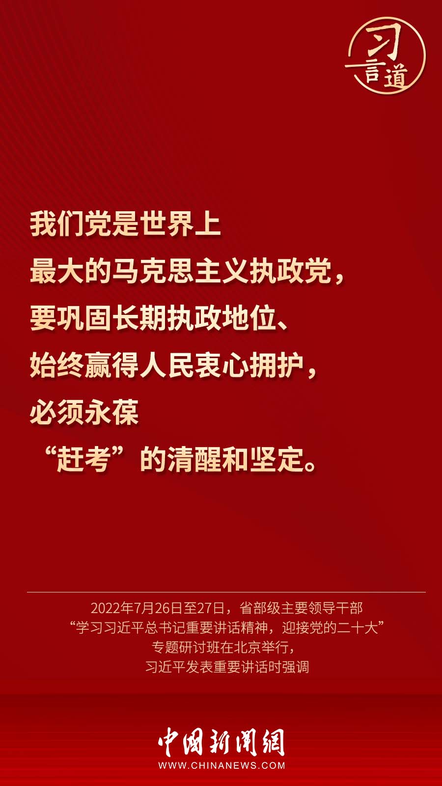7月26日至27日,在省部級主要領導干部專題研討班開班式上,習近平總書記發表重要講話指出,必須永葆“趕考”的清醒和堅定。關于走好新的“趕考”之路,總書記曾強調——